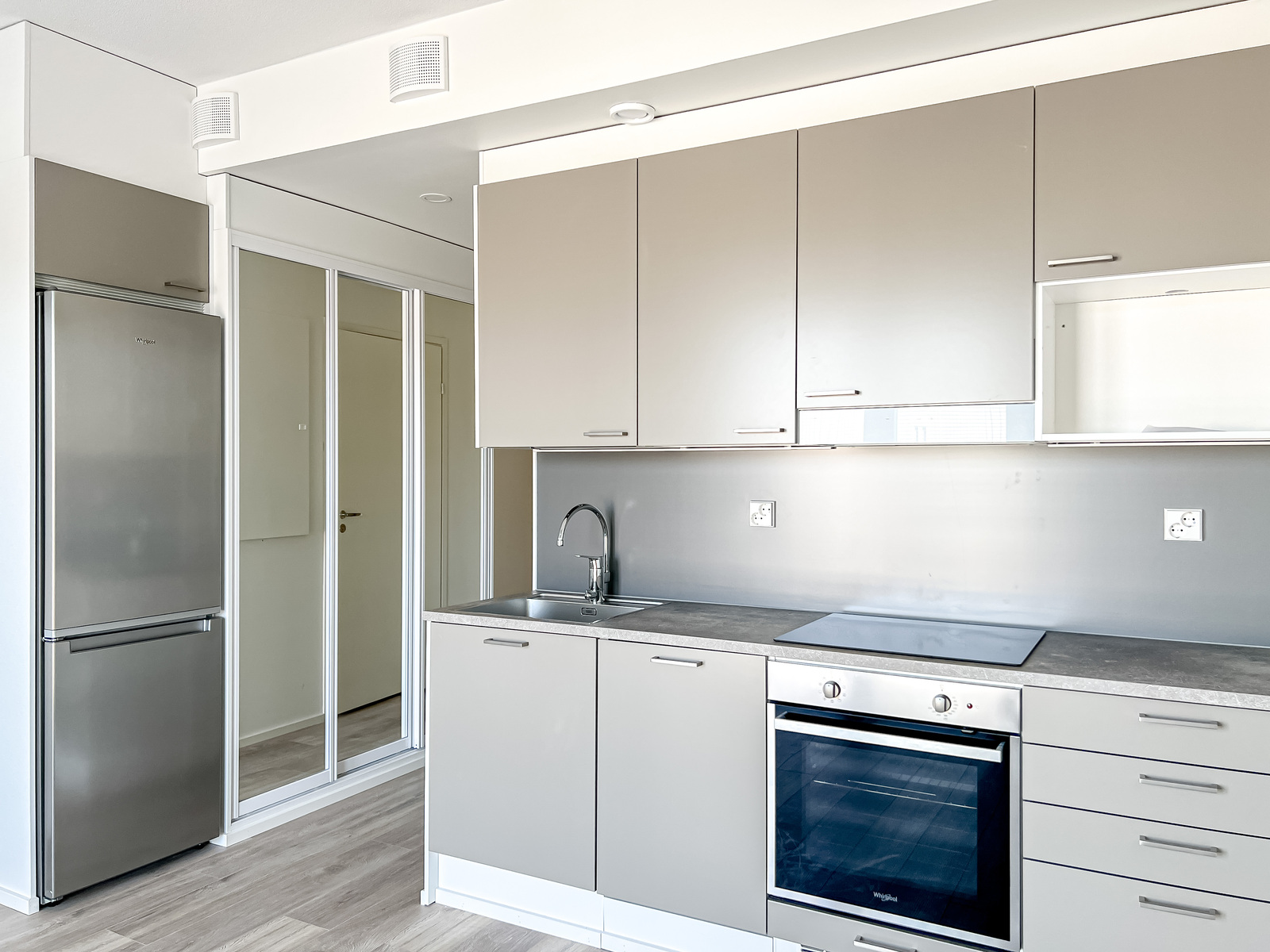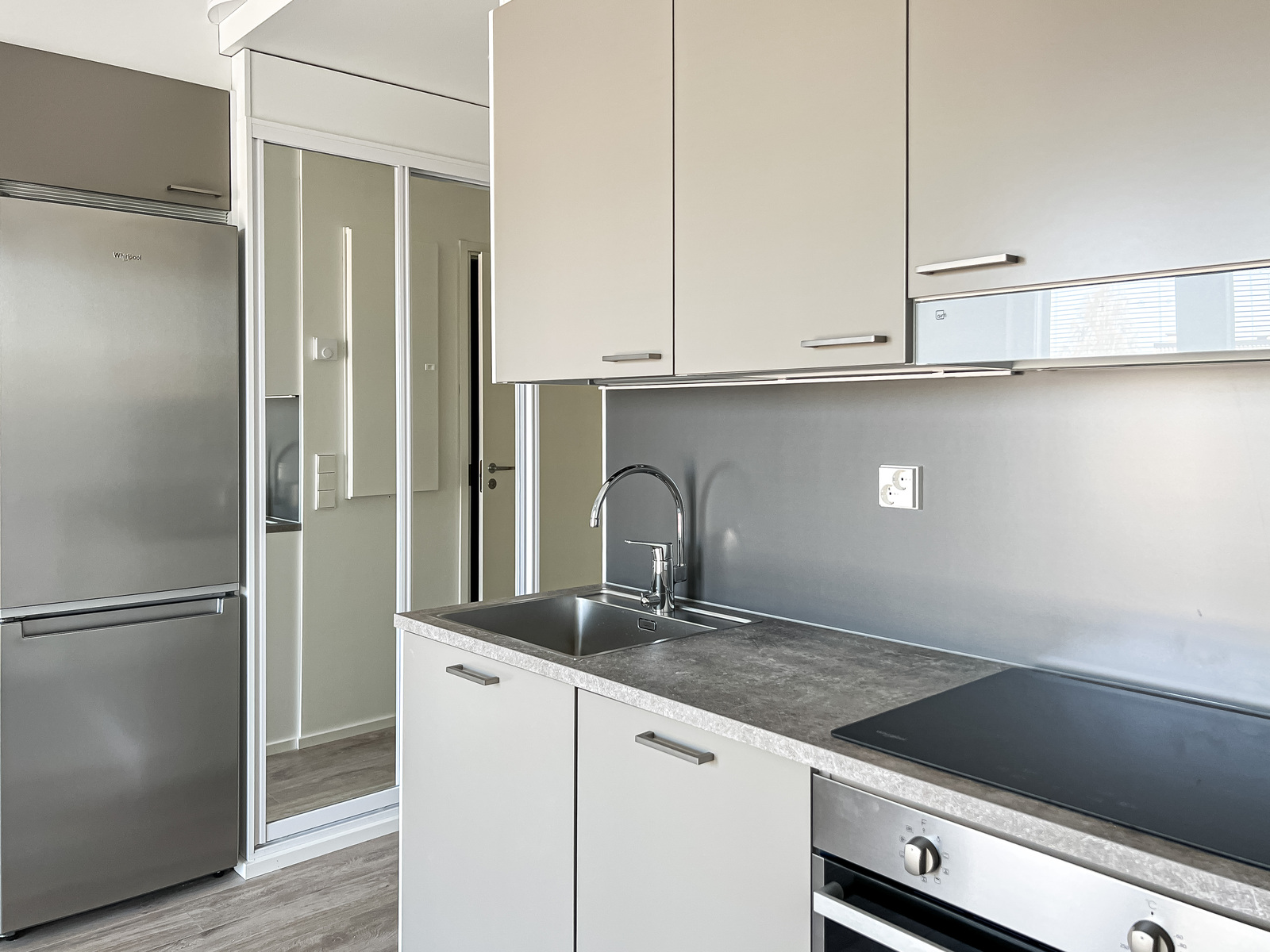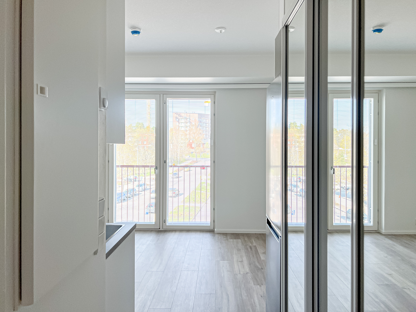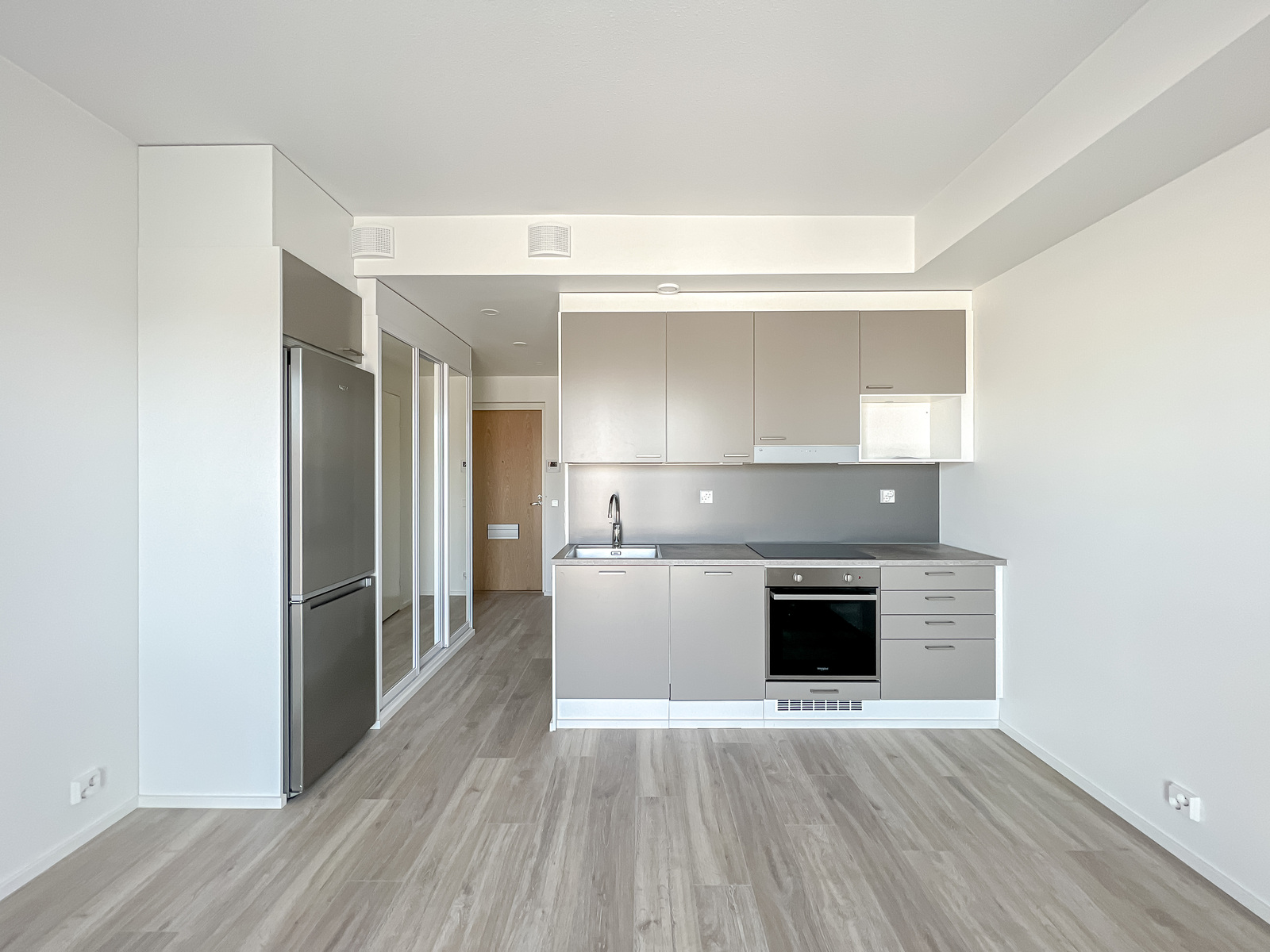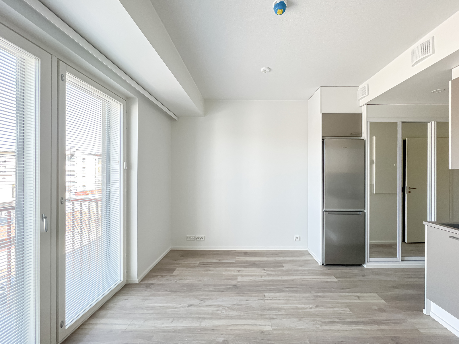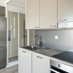 Tähän kotiin on helppo ihastua. Raikkaat neutraalit pinnat mahdollistavat asunnon helpon sisustamisen mieleiseksi. Isoista ikkunoista valo pääsee hyvin asuntoon tehden asunnosta valoisan. Tyylikkäässä avokeittiössä on tilaa työskennellä ja sieltä löytyy kaikki tarvittava. Ranskalaiselta parvekkeelta kelpaa ihastella maisemia. Moderni kylpyhuone on tilava ja sieltä löytyy omalle pesukoneelle paikka.