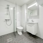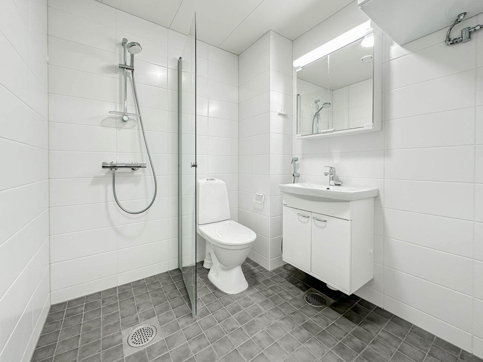 • Varusteet: suihkuseinä, pesukoneliitäntä, lattialämmitys, wc-istuin, suihku, peilikaappi