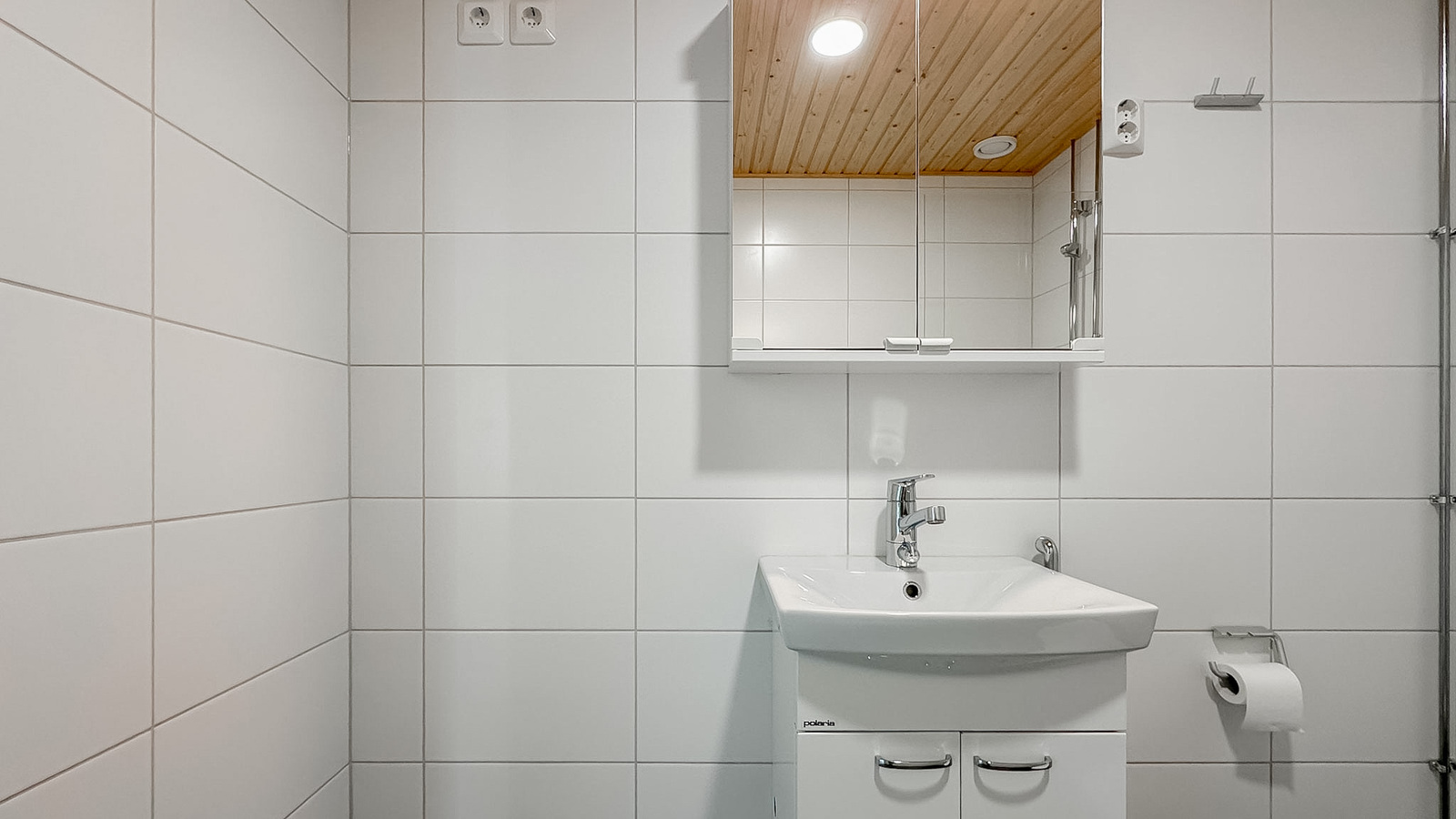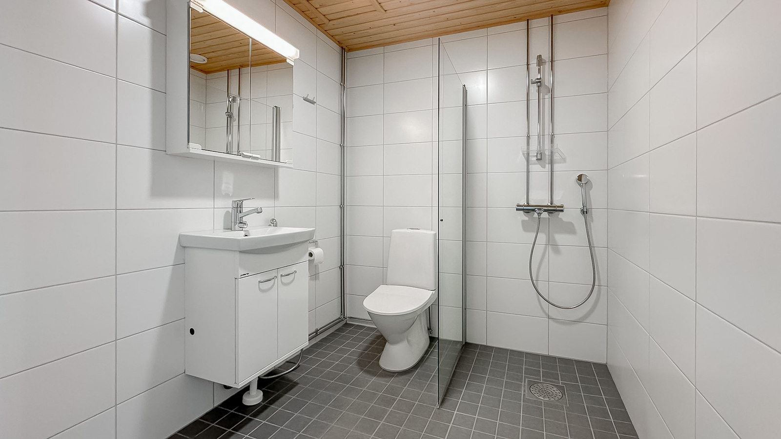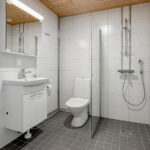 • Varusteet: suihkuseinä, pesukoneliitäntä, lattialämmitys, wc-istuin, peilikaappi