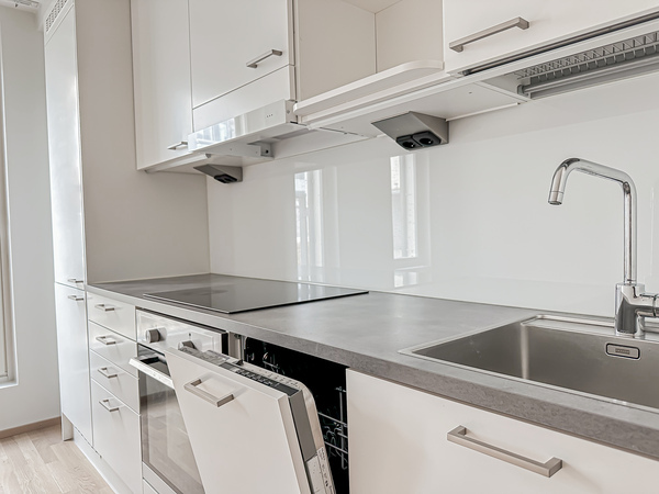 Tässä vaaleassa kodissa on moderni ja tyylikäs sisustus sekä integroidut kodinkoneet. Pitkänmallinen pohjaratkaisu on helpottaa sisustamista ja tilaa löytyy jopa parisängylle, sohvalle sekä ruokailuryhmälle.