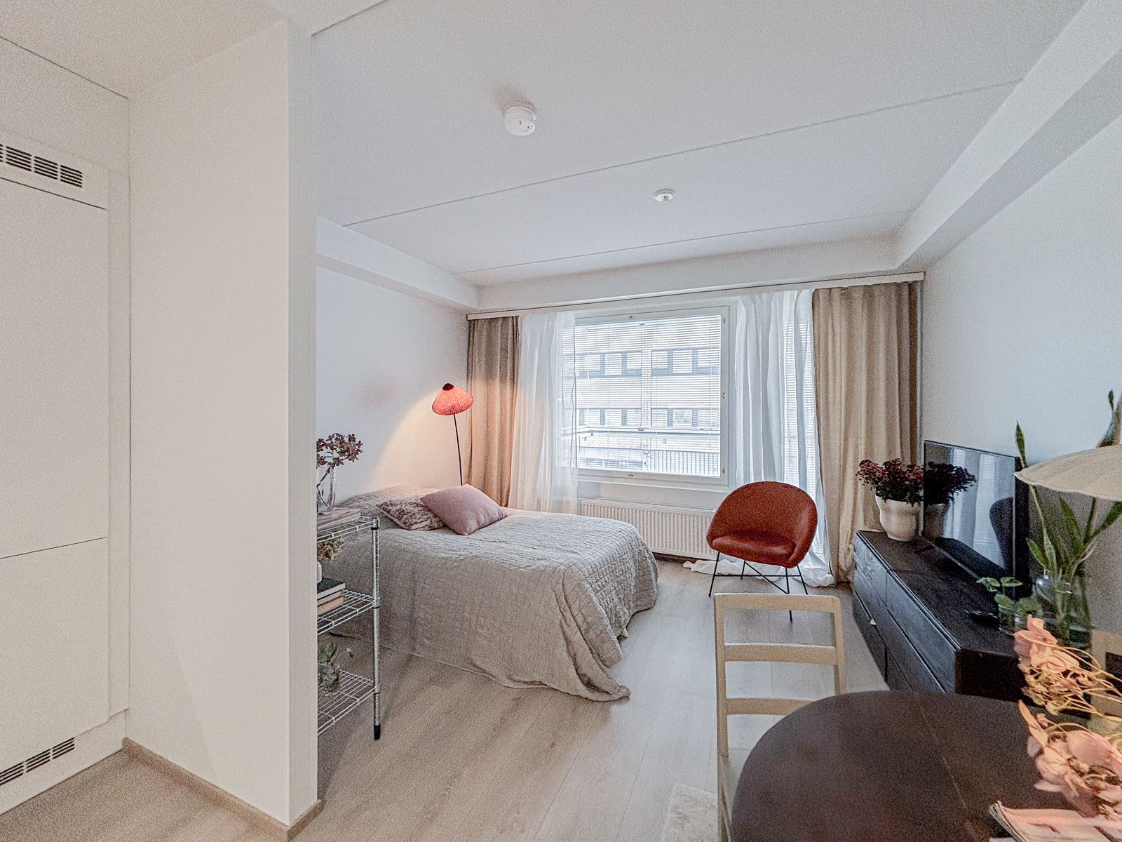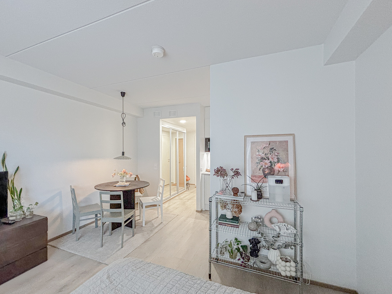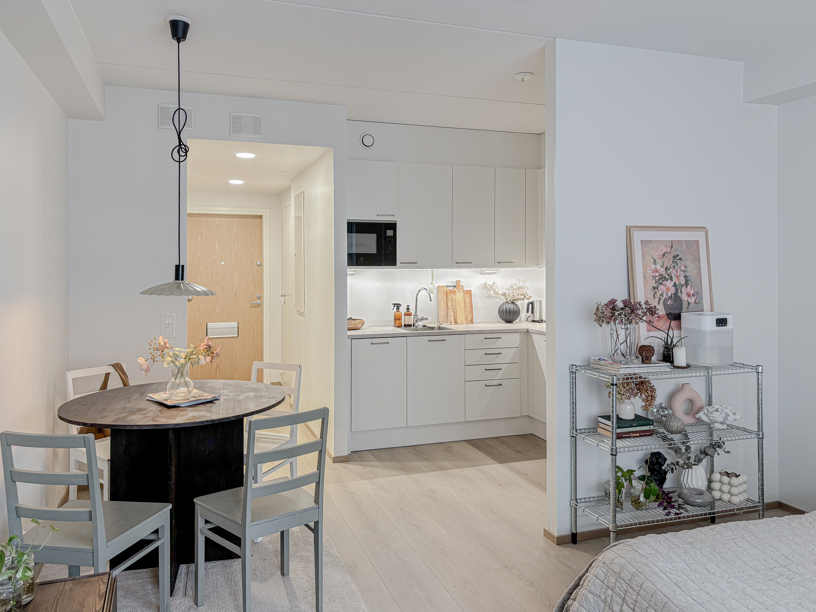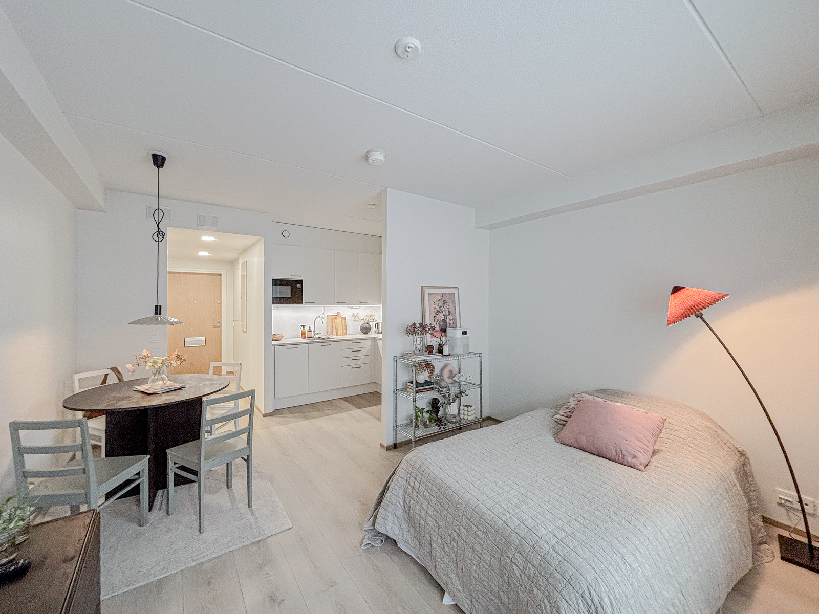 Tässä kodissa on tilava alkovi, minne voi sijoittaa fiksusti sängyn. Näin muu huone on helppo sisustaa oleskeluun. Lisätilantuntua on tuomassa tilava lasitettu parveke. Asunnossa on modernit varustelut ja kauniin valkeat pinnat!
