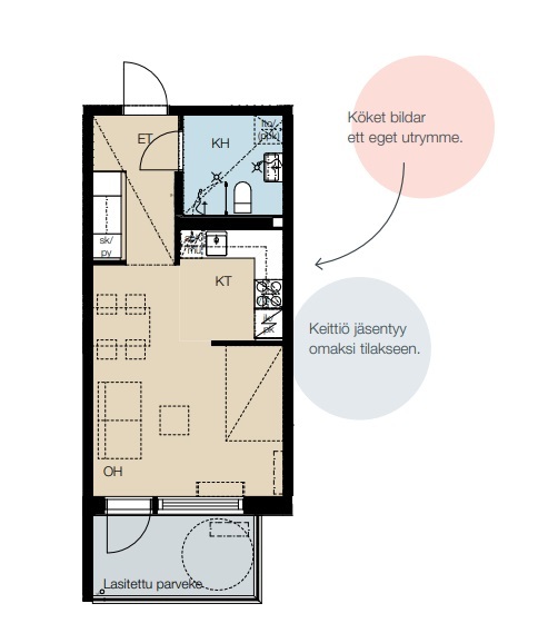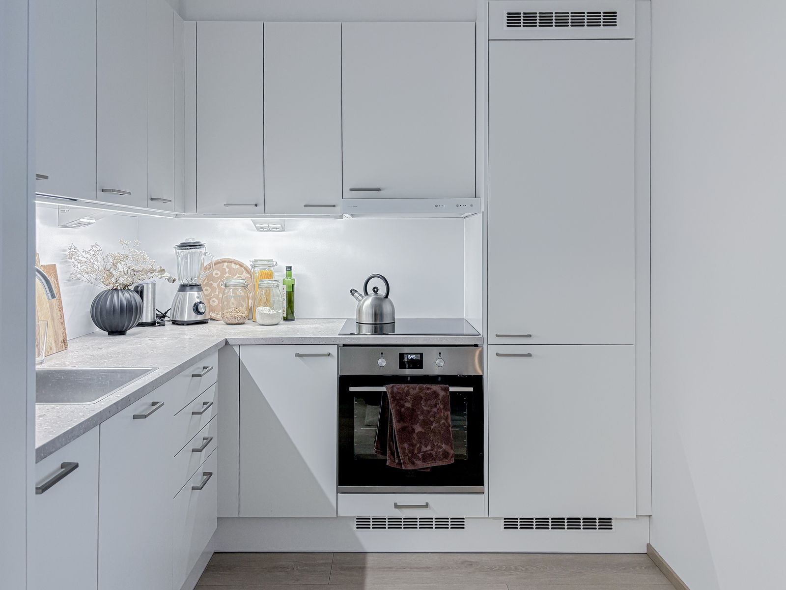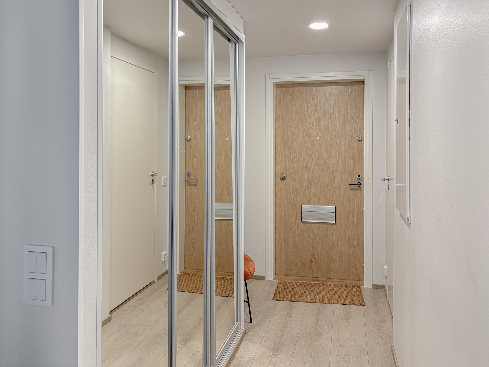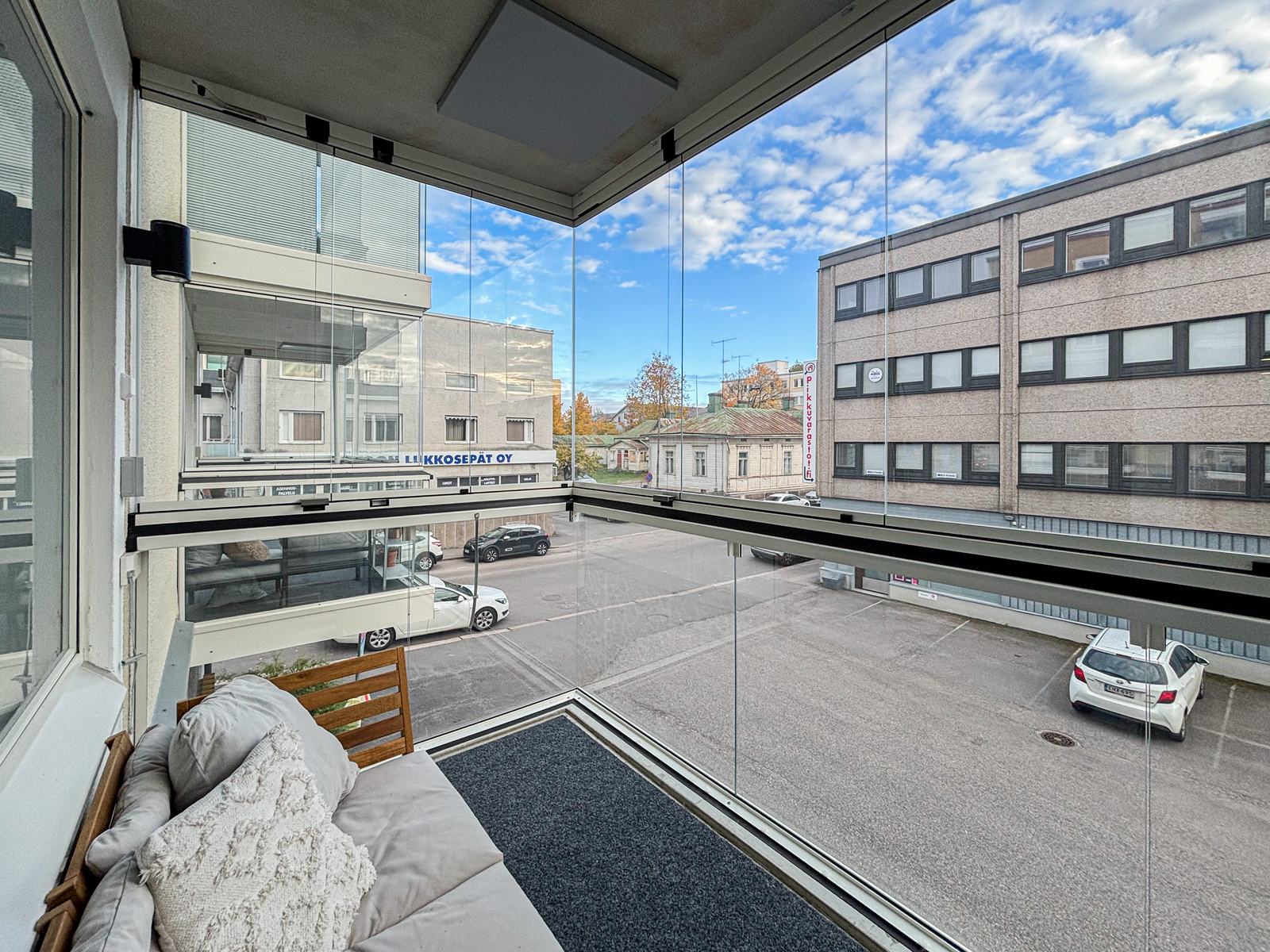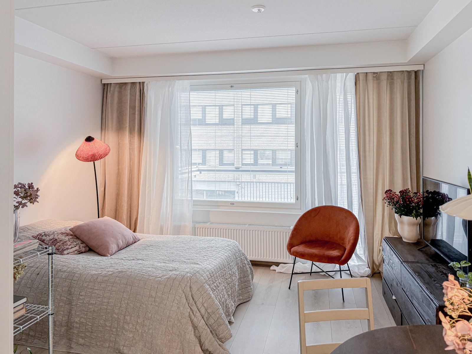 Tässä kodissa on tilava alkovi, minne voi sijoittaa fiksusti sängyn. Näin muu huone on helppo sisustaa oleskeluun. Lisätilantuntua on tuomassa tilava lasitettu parveke. Asunnossa on modernit varustelut ja kauniin valkeat pinnat!