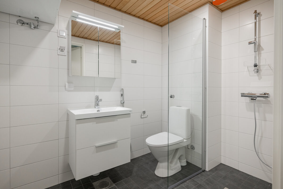 • Varusteet: suihkuseinä, pesukoneliitäntä, wc-istuin, suihku, peilikaappi