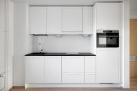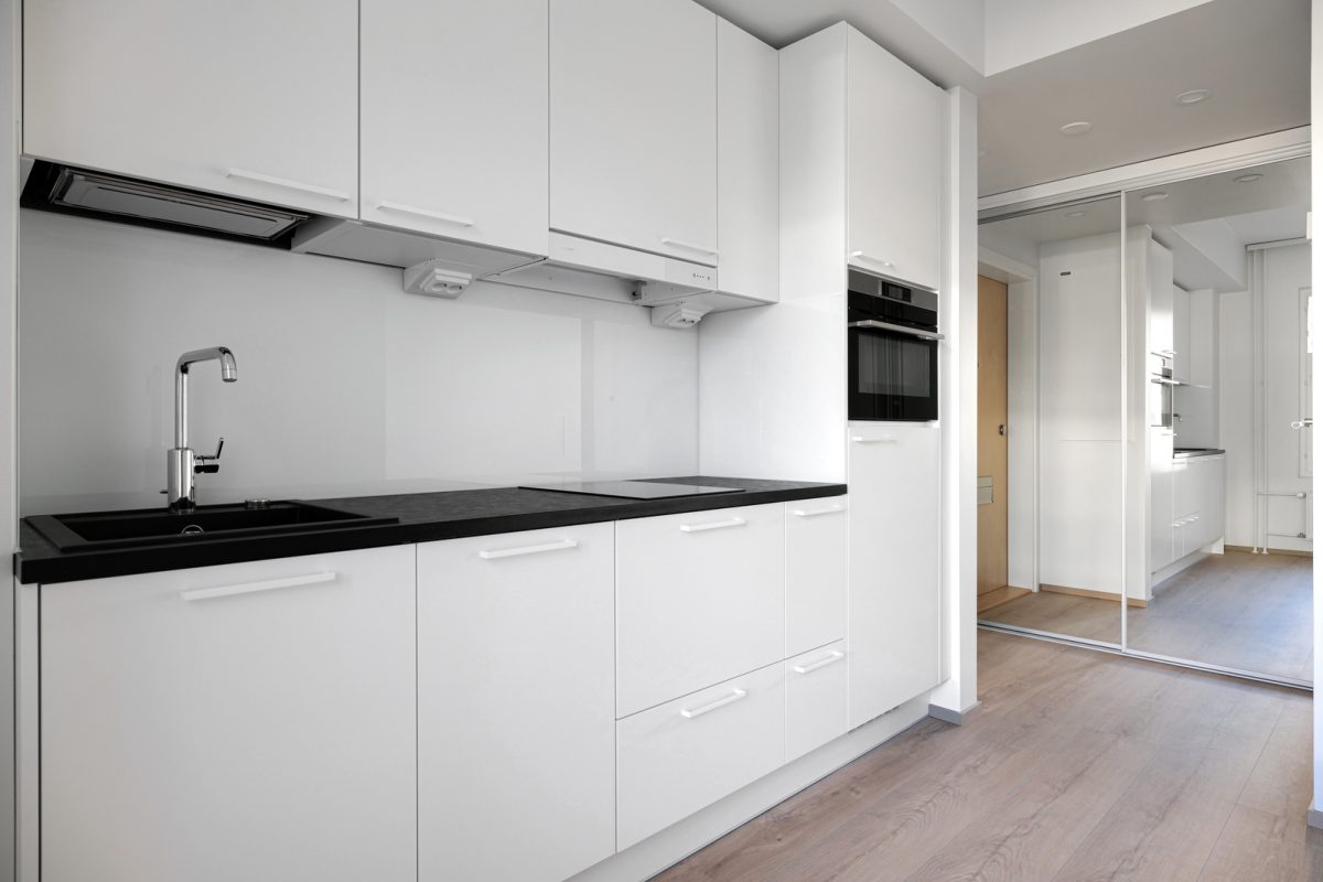 vierelle ja yläpuolelle on sijoitettu kaappeja. Keittiö on ajattoman tyylikäs valkoisine kaapistoineen ja integroituine kodinkoneineen. Kylpyhuone on kauniisti laatoitettu ja siellä on paikka omalle pyykinpesukoneelle. Lasitettu länsiparveke sisäpihan suuntaan on kuin viihtyisä lisähuone aikaisesta keväästä myöhäiseen syksyyn.