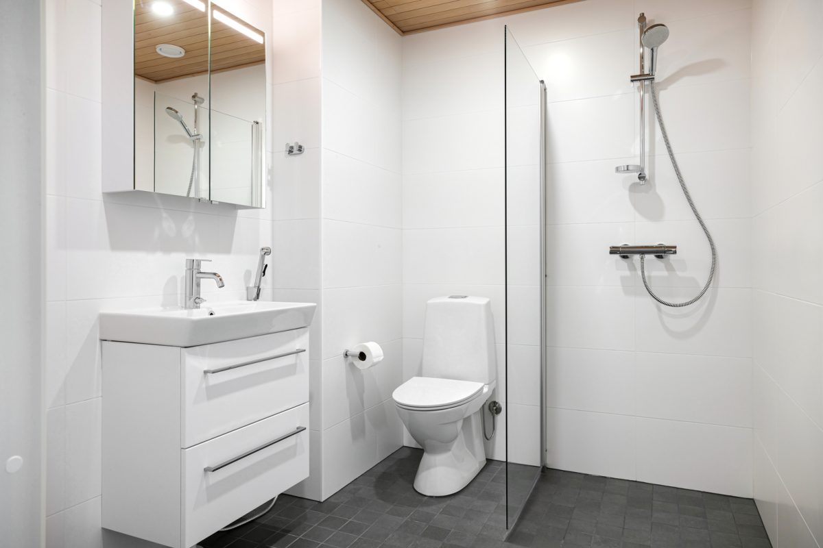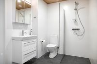 • Varusteet: suihkuseinä, pesukoneliitäntä, lattialämmitys, wc-istuin, suihku, peilikaappi