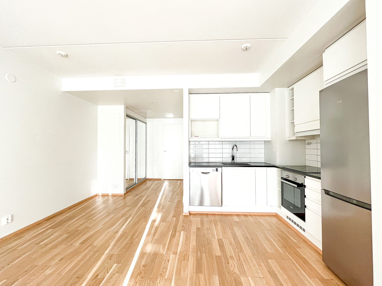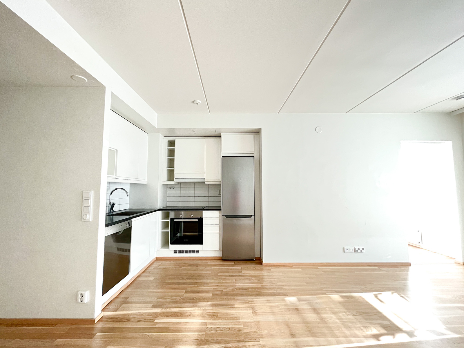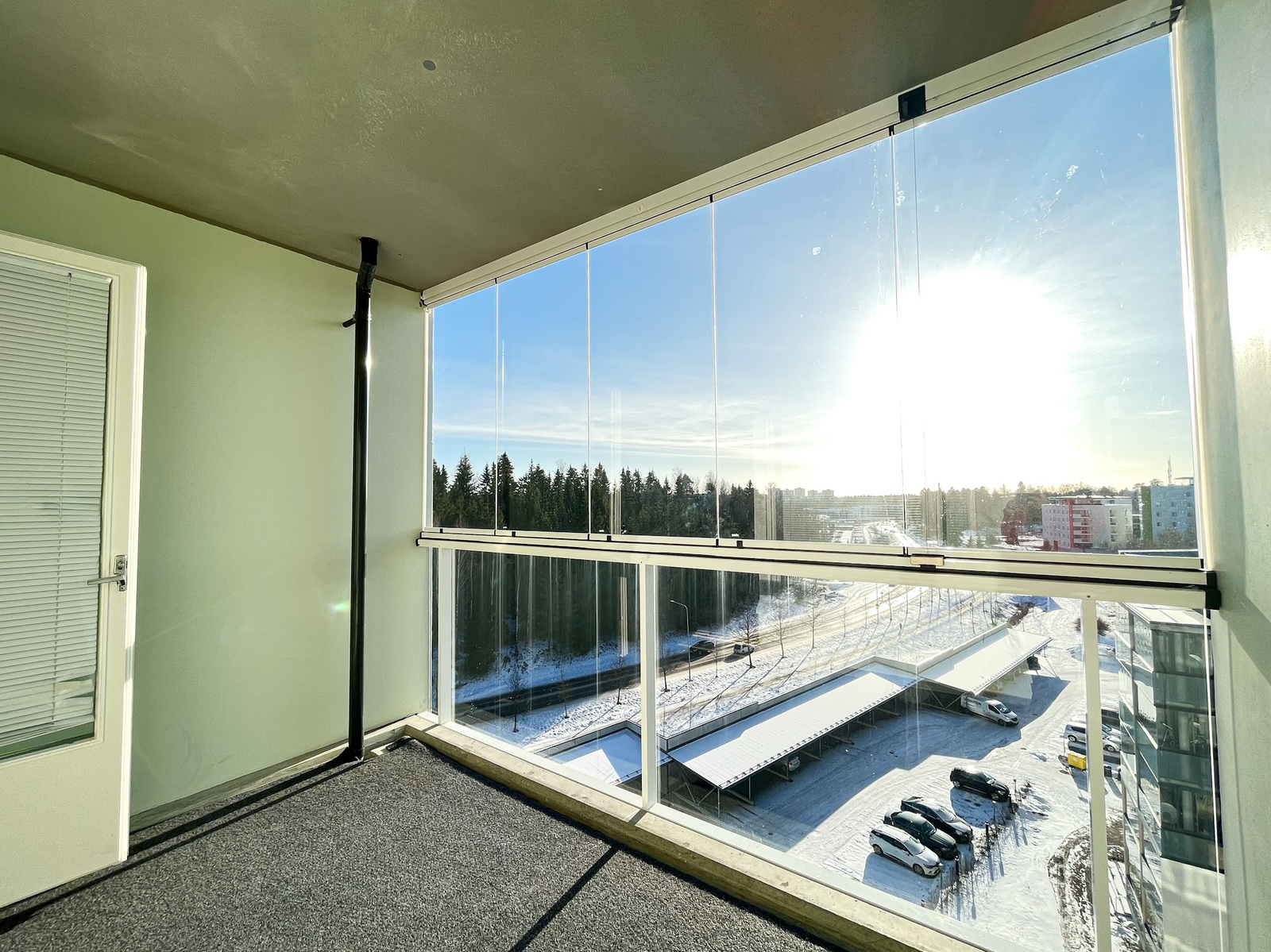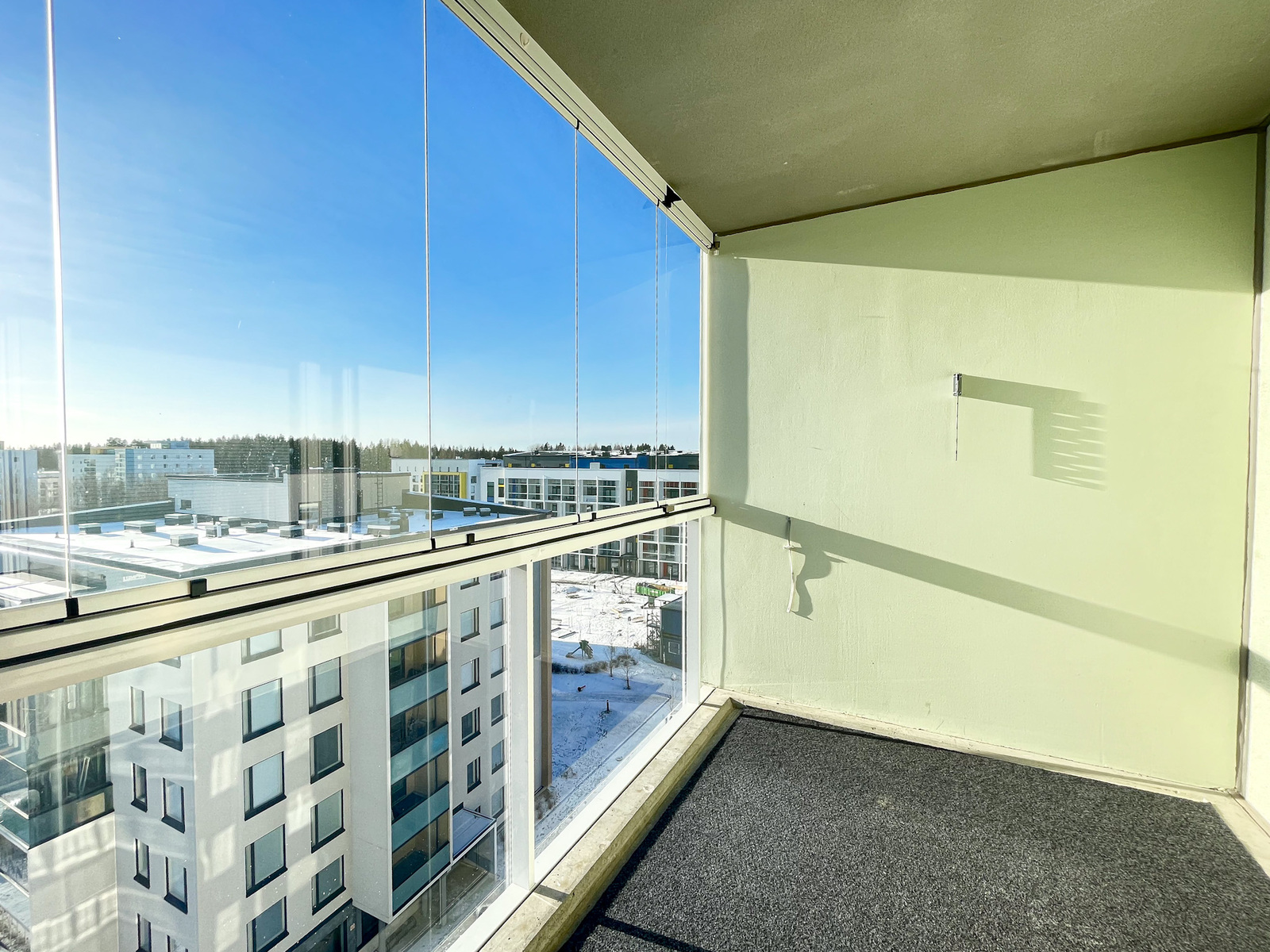 Tässä 8. kerroksen asunnossa on selkeä ja toimiva pohja, joka mahdollistaa asunnon helpon sisustamisen mieleiseksi. Tyylikkäässä avokeittiössä on tilaa työskennellä ja sieltä löytyy kaikki tarvittava. Olohuone ja keittiö ovat avointa yhteistä tilaa. Olohuoneen kautta kulku lasitetulle parvekkeelle, josta on upeat näkymät. Kaappitilaa löytyy kivasti niin eteisestä kuin makuuhuoneestakin. Kylpyhuoneesta löytyy pesukoneliitäntä.