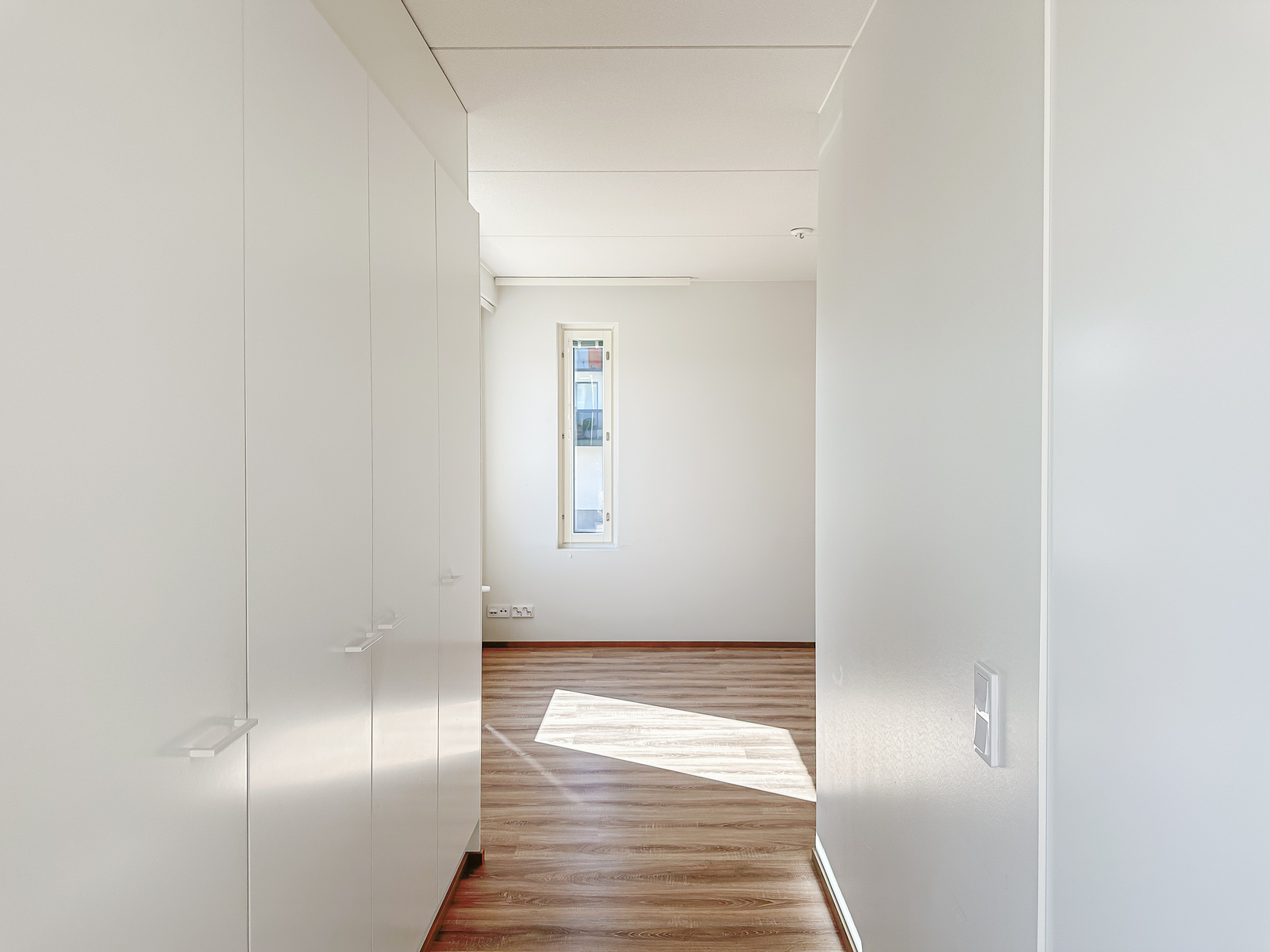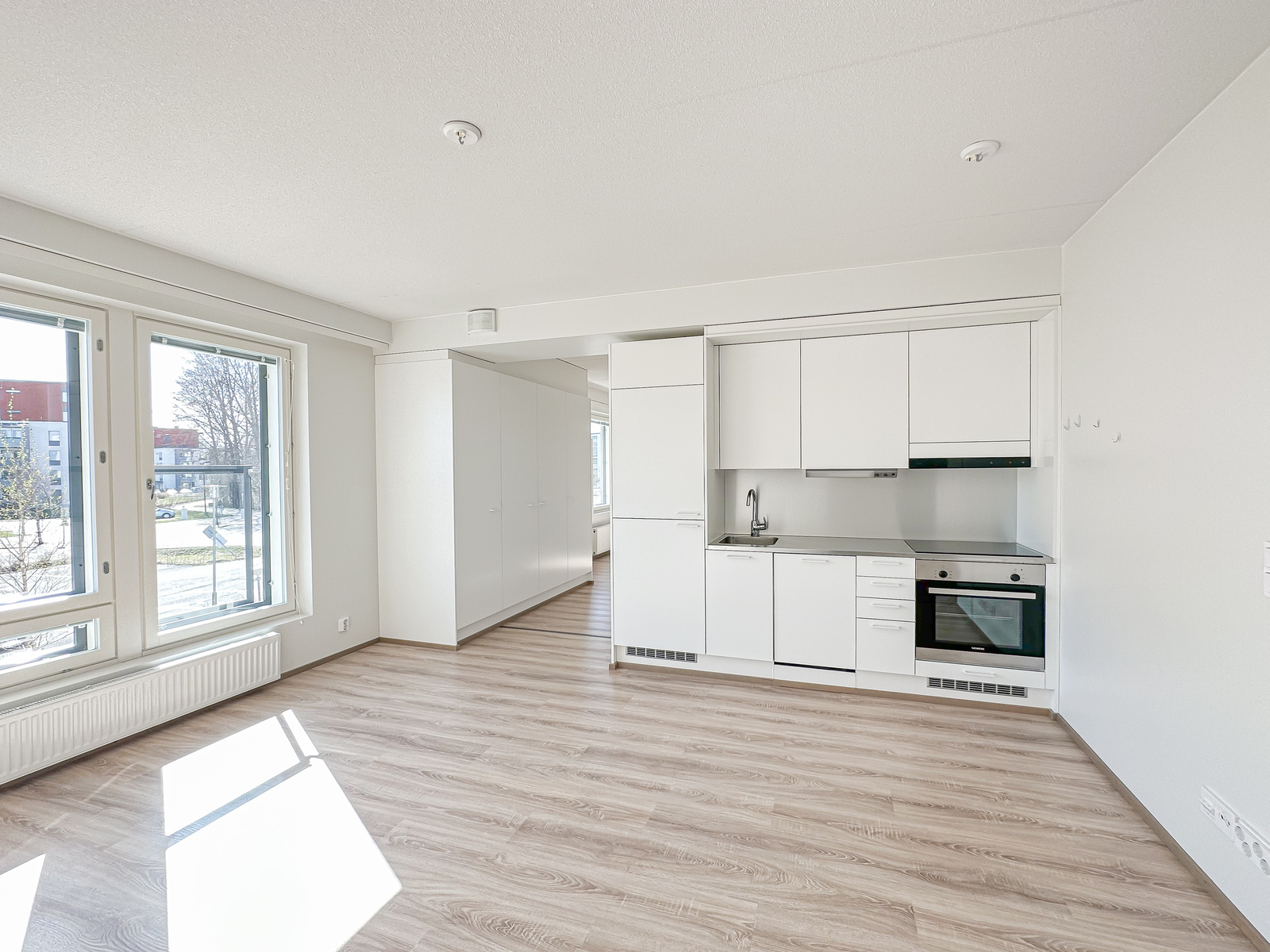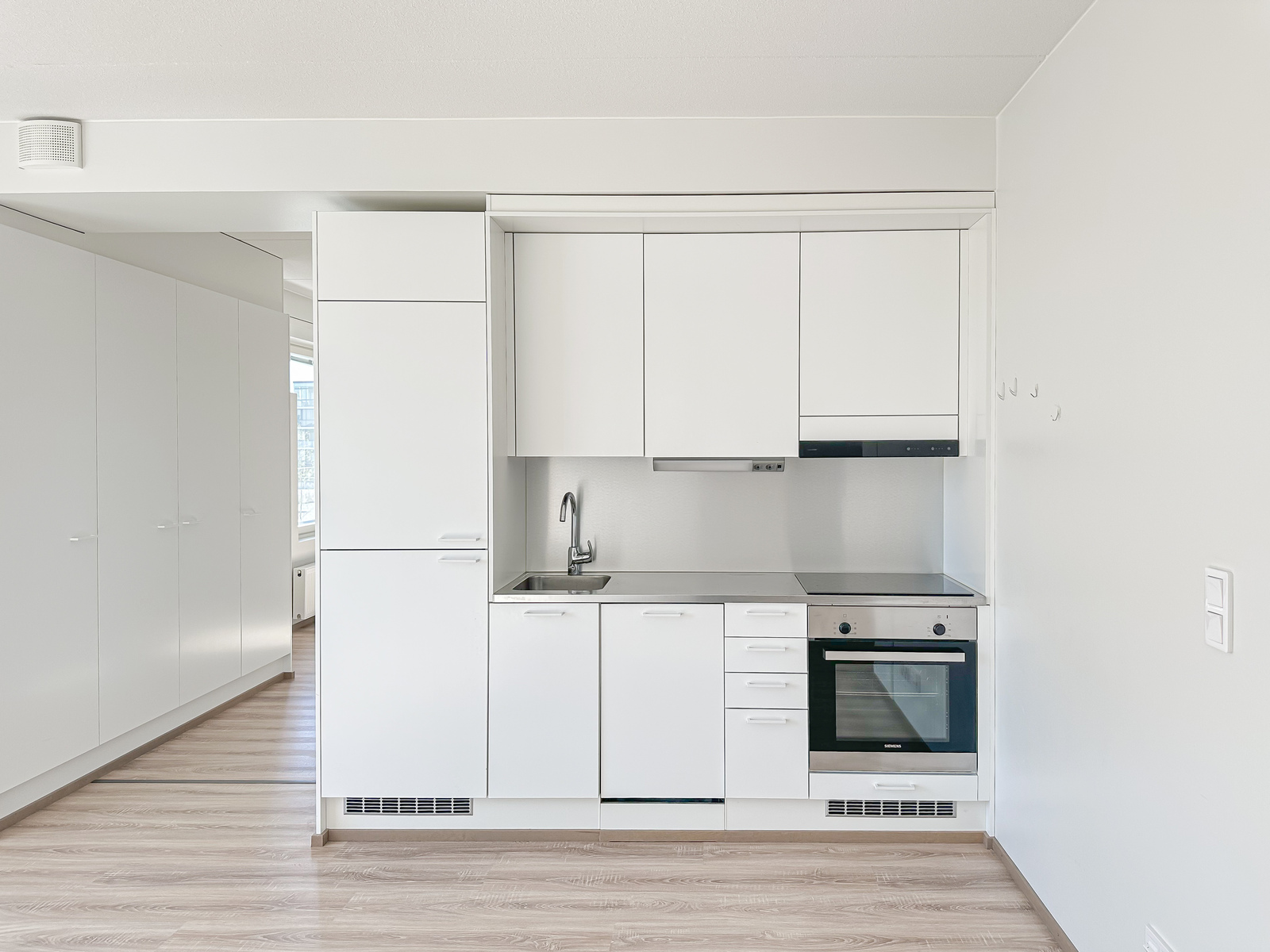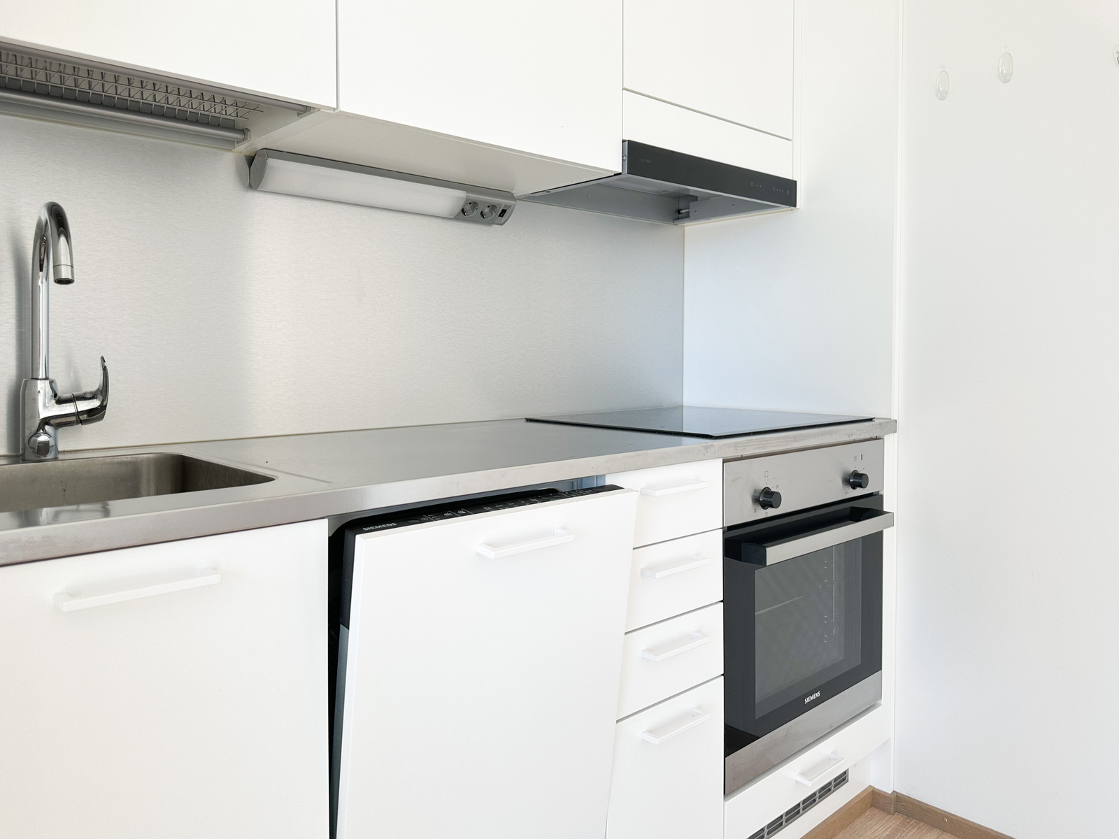 Tehokkaalla pohjaratkaisulla varustettu koti, jossa on laadukkaat materiaalit viihtyisään asumiseen. Keittiö on kompaktin kokoinen ja toimiva ja sieltä löytyy myös astianpesukone arkea helpottamaan. Kylpyhuone on tilava ja sieltä löytyy pesukoneliitäntä, joka on kätketty kätevästi kaappiin.