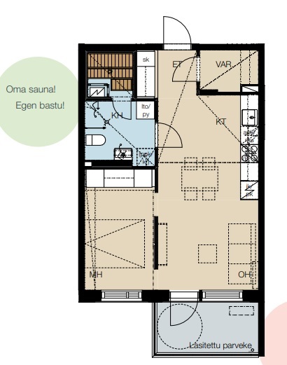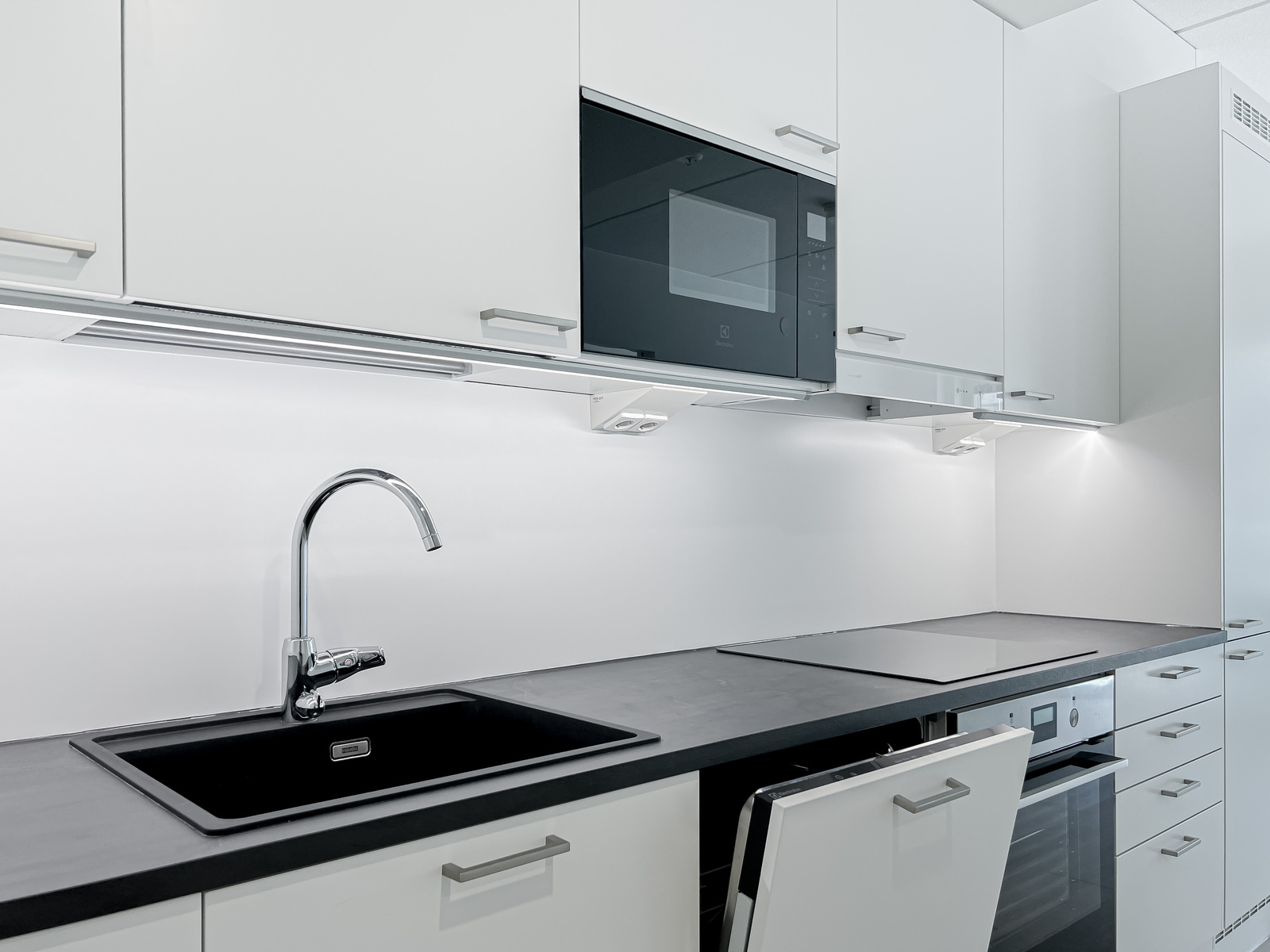 • Pesutiloissa on asunnon sähköön liitetty mukavuus lattialämmitys. Asunnoissa on etäluettava kylmän ja lämpimän käyttöveden kulutuksen mittaus.