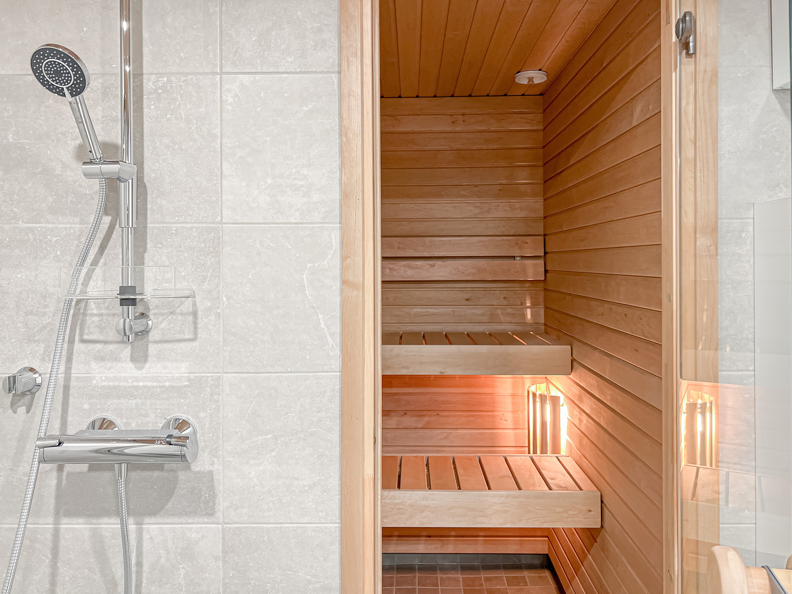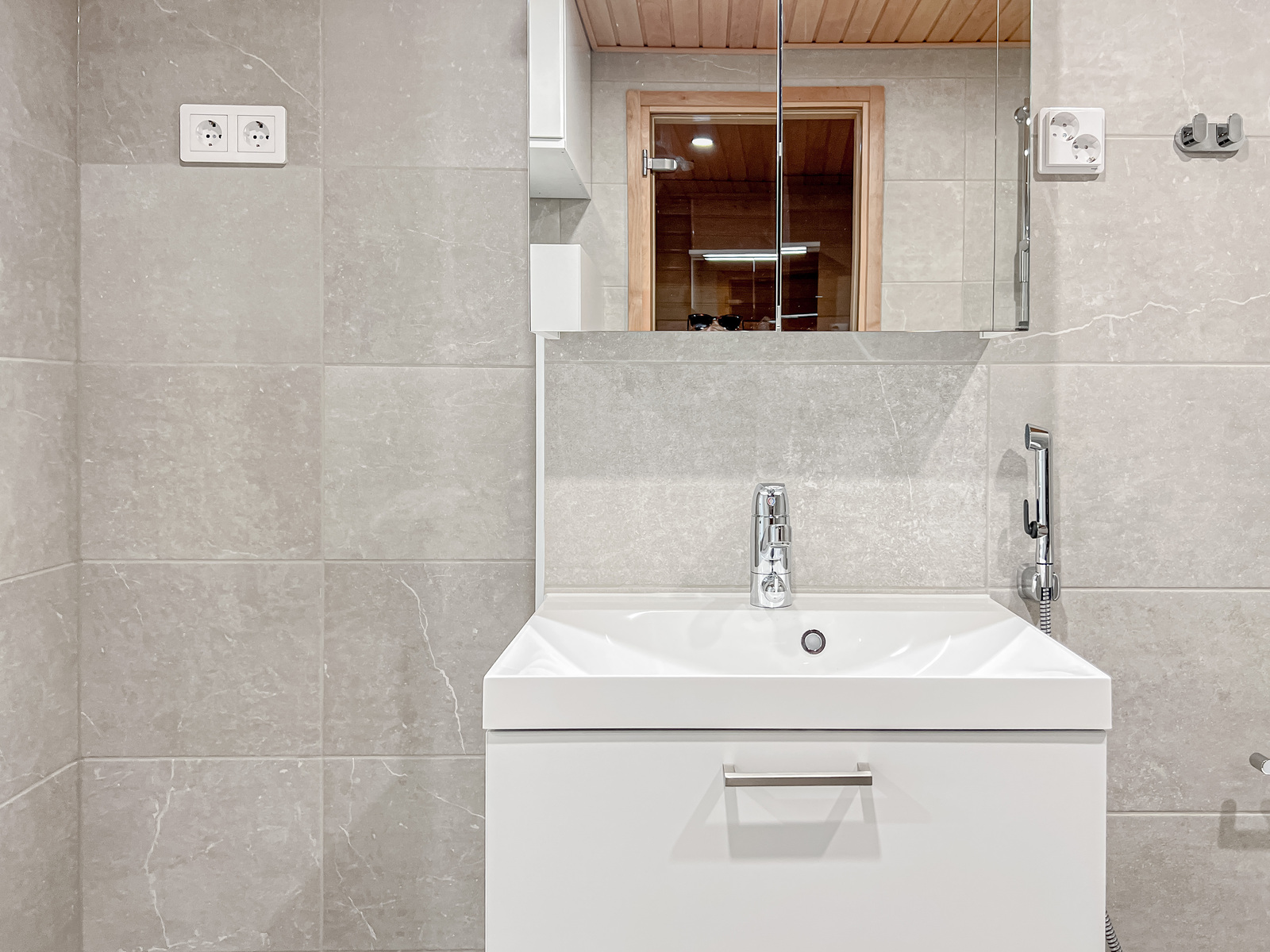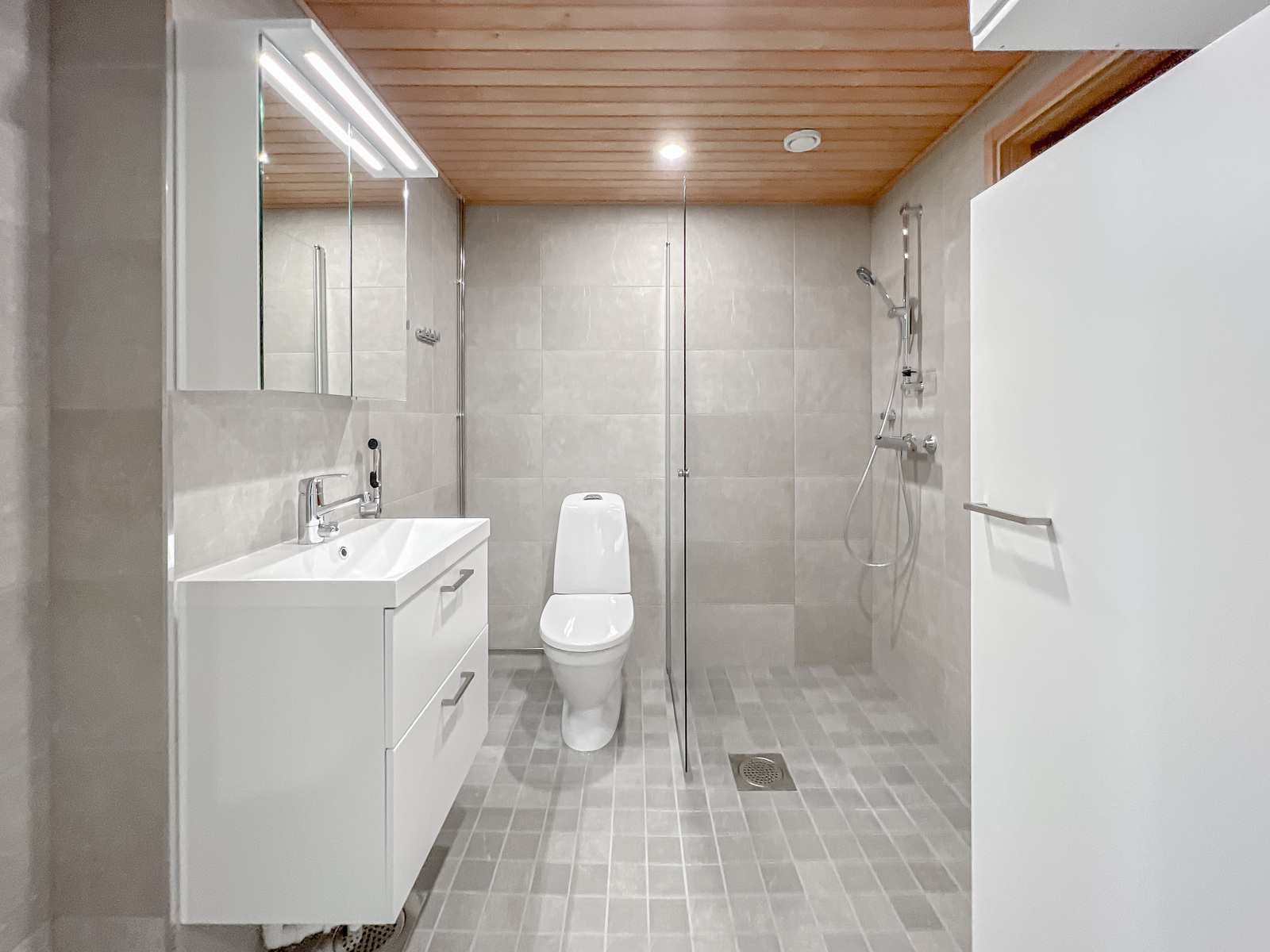 • Varusteet: suihkuseinä, pesukoneliitäntä, lattialämmitys, suihku, peilikaappi