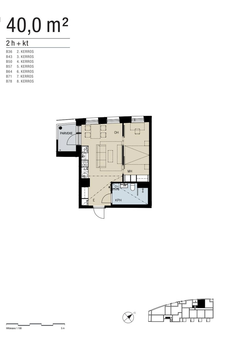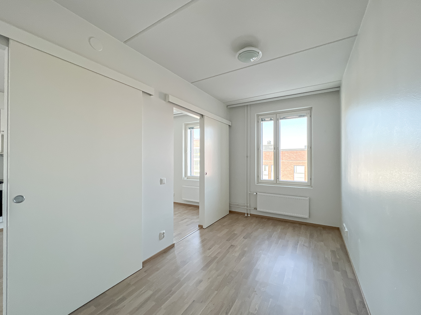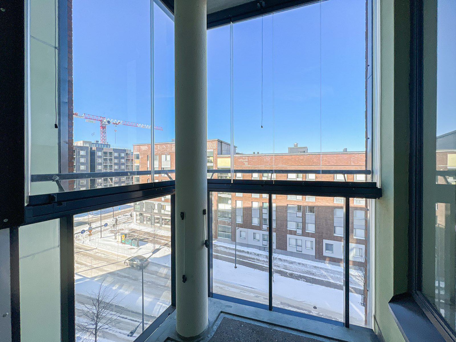 Avokeittiö ja olohuone muodostavat yhdessä viihtyisän oleskelutilan, jossa on monenlaiset mahdollisuudet sisustamiselle. Olohuoneen yhteydestä on käynti lasitetulle parvekkeelle, josta aukeaa näkymät kadun puolelle. Säilytystilaa löytyy sekä eteisen, että makuuhuoneen puolelta. Kylpyhuone on laatoitettu ja siellä on varaus pyykinpesukoneelle.