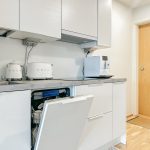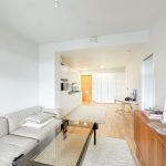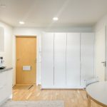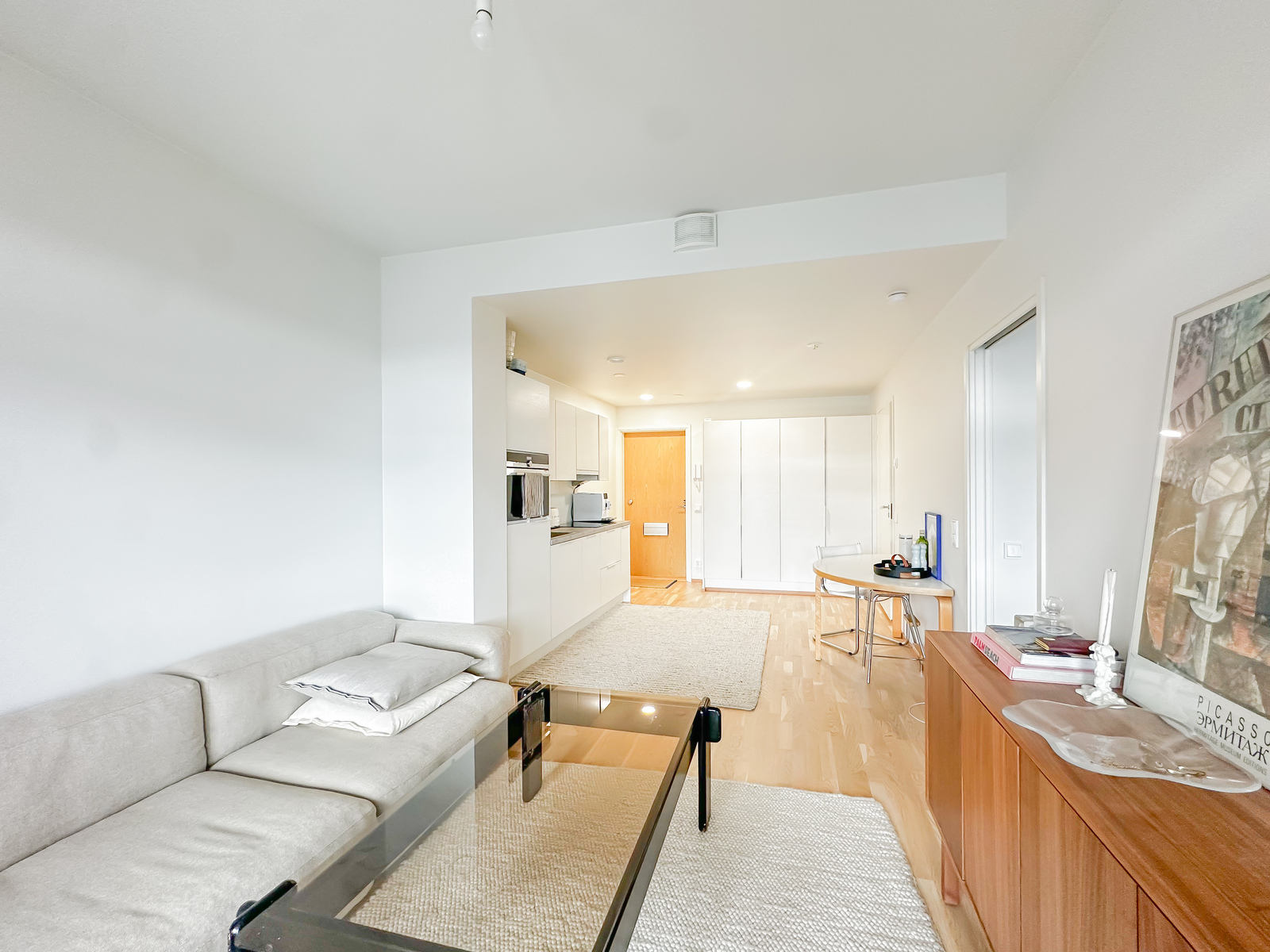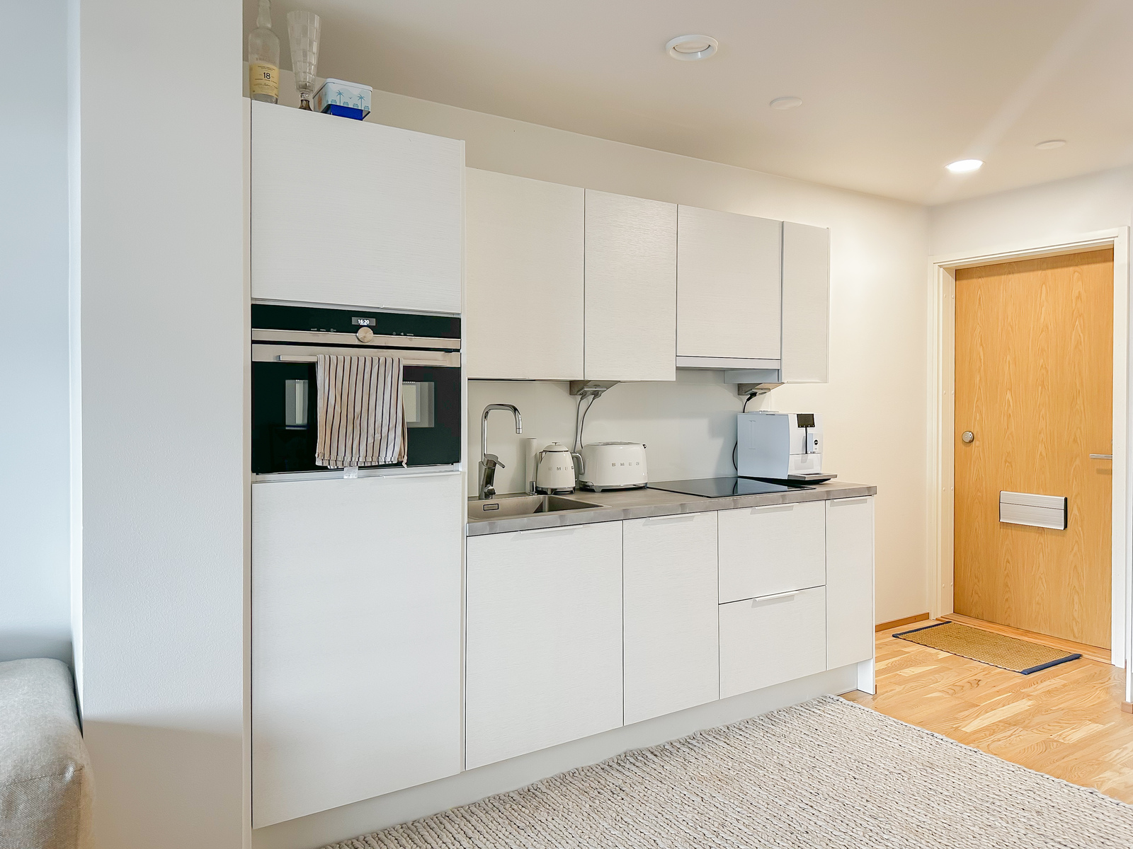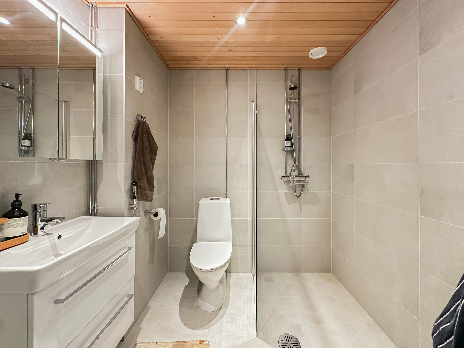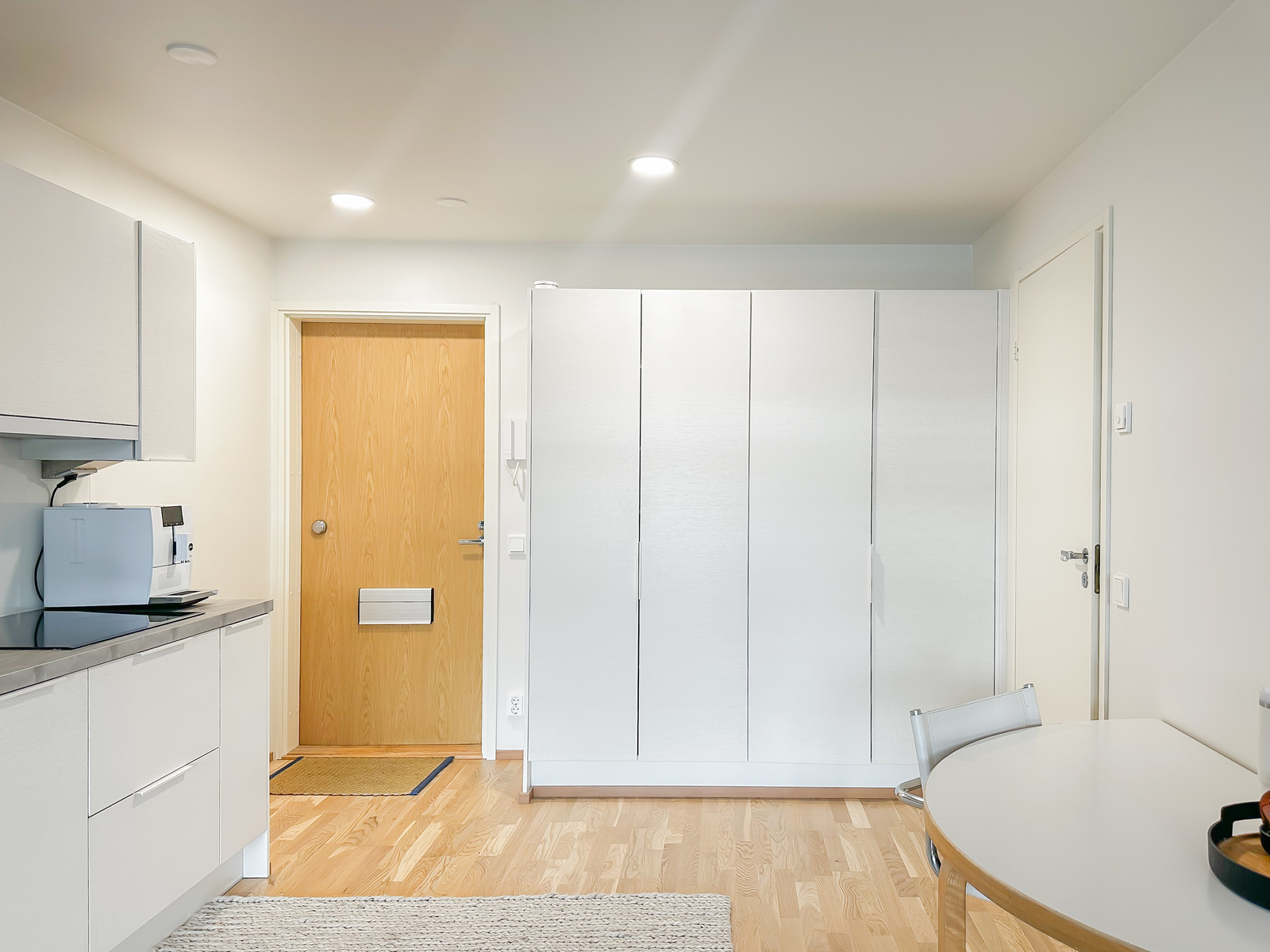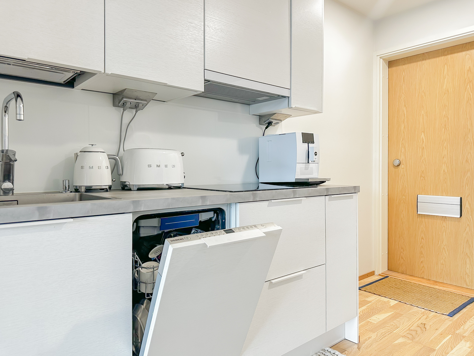 Kodin vaaleasävyinen keittiö on varusteltu integroiduilla kodinkoneilla, kuten astianpesukoneella ja induktioliedellä. Tyylikkäässä kylpyhuoneessa on lattialämmitys ja tilavaraus pesukoneelle. Koko asunnon leveältä lasitetulta parvekkeelta avautuu kauniit sisäpihan näkymät. Suuret ikkunat tekevät kodin tunnelmasta avaran ja valoisan. Taloyhtiöstä löytyy asukkaiden käyttöön mm. hienot saunatilat, viihtyisä kerhotila yhteiseen oleskeluun, sekä pesutupa.