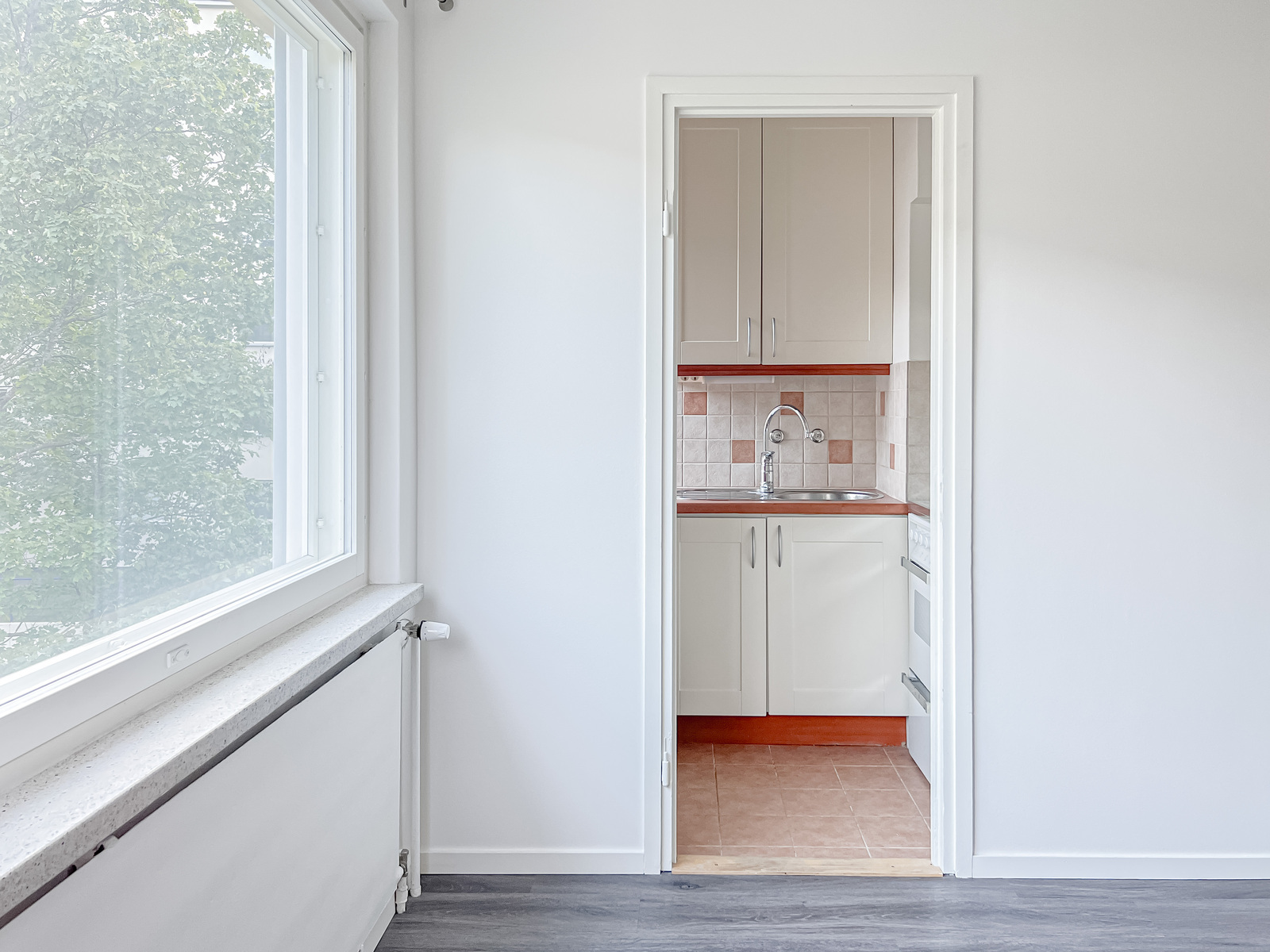 Tässä kodissa on käytännöllinen pohjaratkaisu. Tilavan olohuoneen saa suljettua omaan rauhaansa välioven avulla, olohuoneen yhteydessä on kompakti keittiö, jonka varusteluihin kuuluu mm. tehokas kaasuliesi.