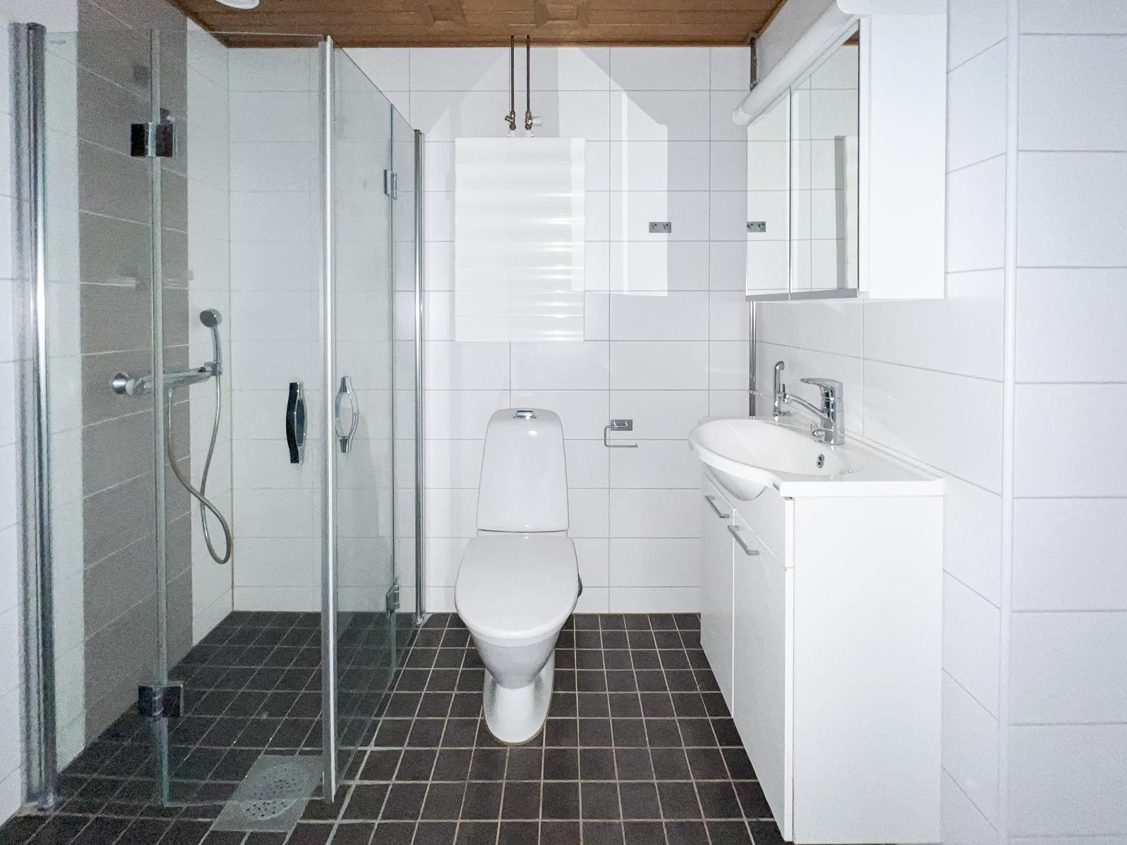 • Varusteet: pesukoneliitäntä, wc-istuin, suihku, peilikaappi