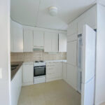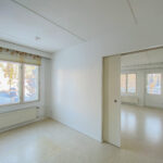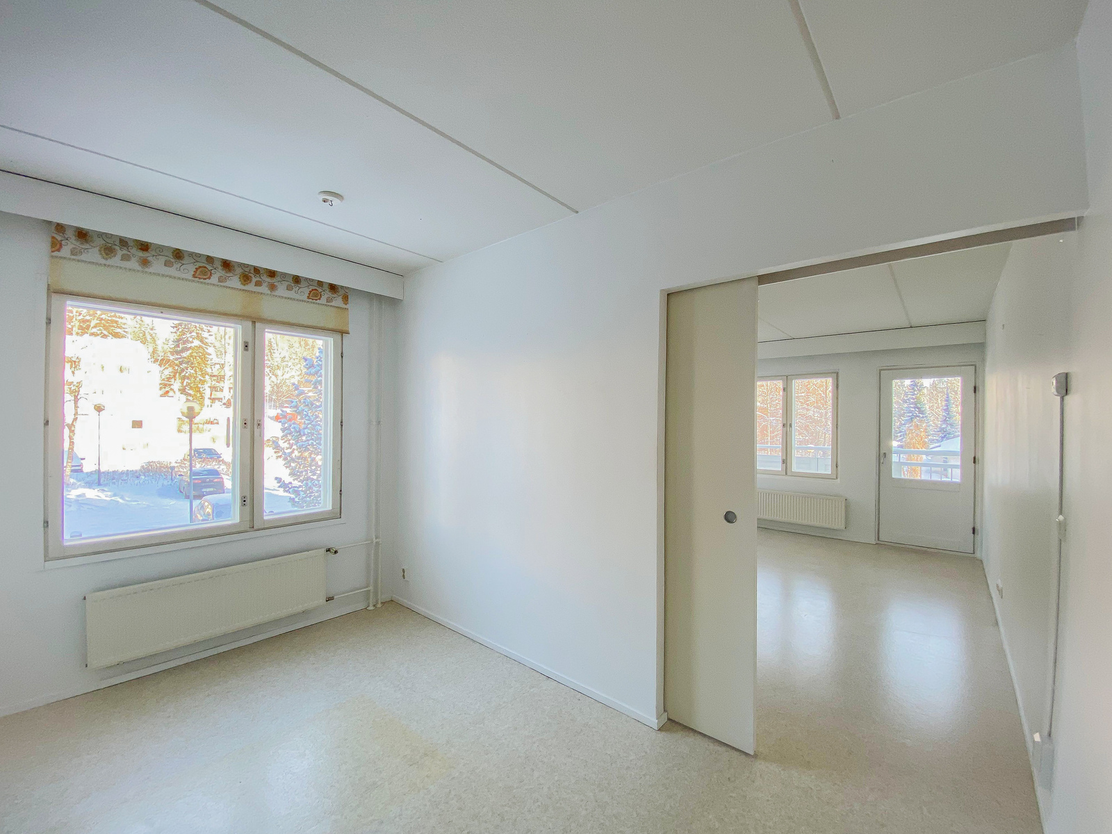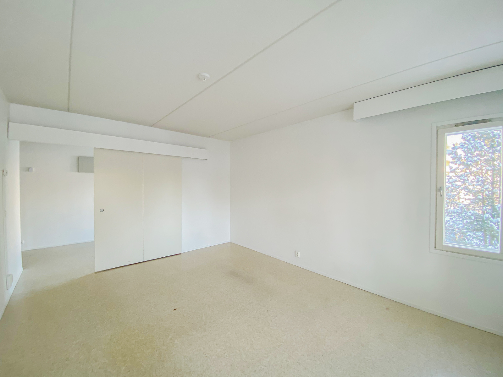 Tässä kodissa on toimiva pohjaratkaisu. Tilavan keittiön yhteydessä on hyvin tilaa ruokapöydälle. Olohuoneen ja keittiön erottaa liukuovi, jonka avulla asunnon voi sisustaa monenlaiseen tarpeeseen sopivaksi. Makuuhuoneessa ja eteisessä on kiinteät kaapistot valmiina, joten säilytystilaakin löytyy riittävästi valmiina!