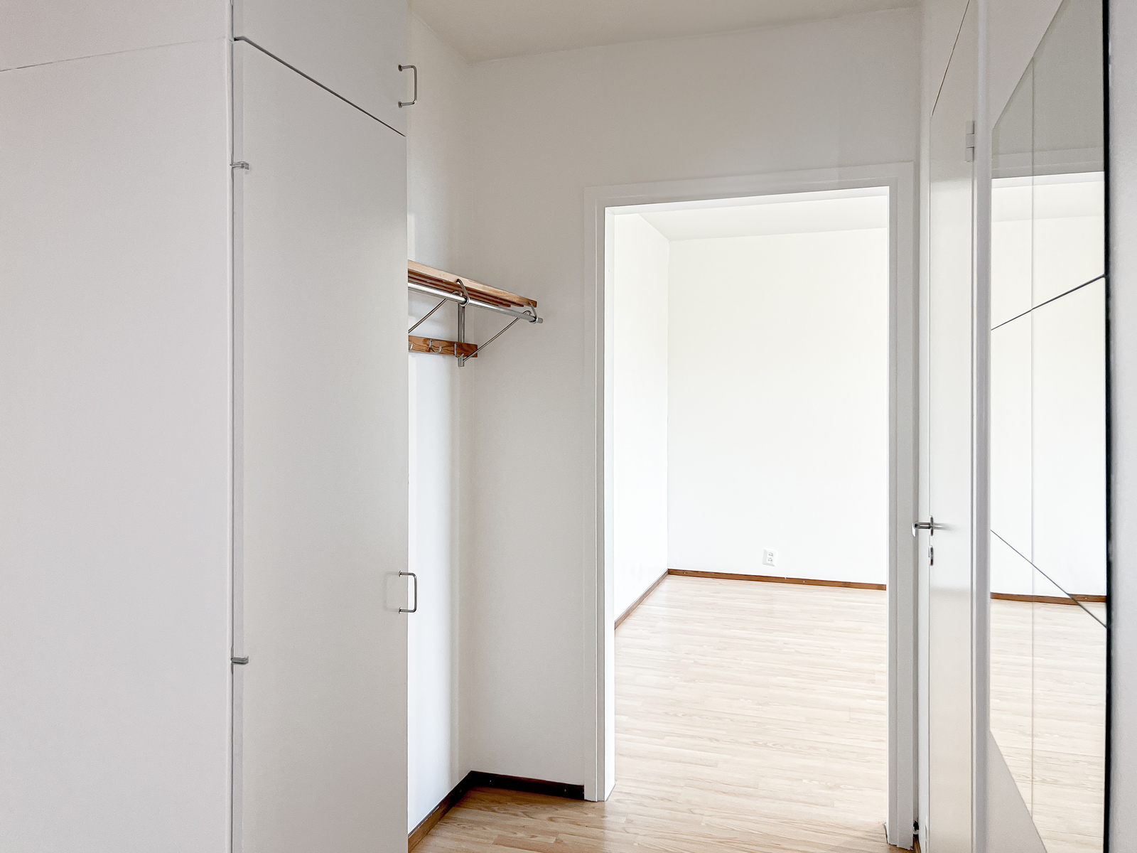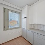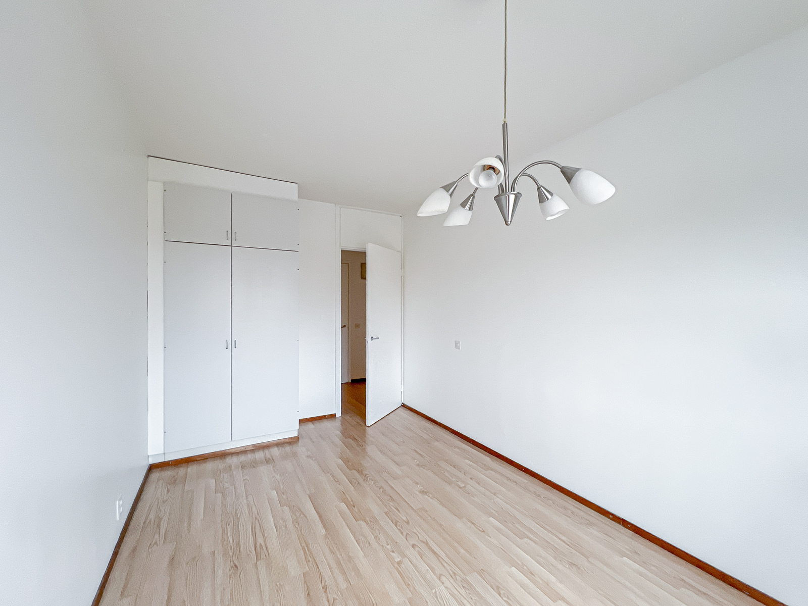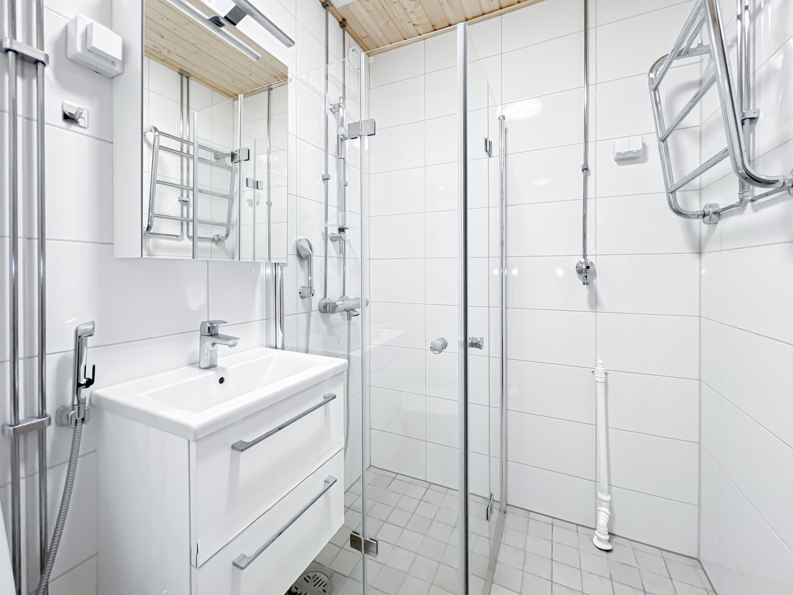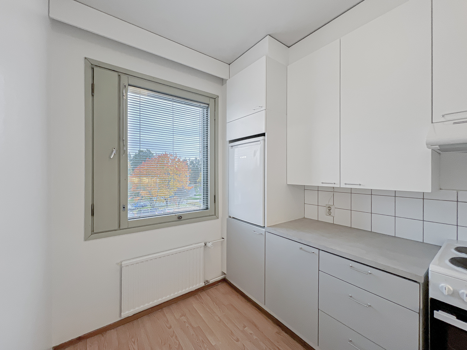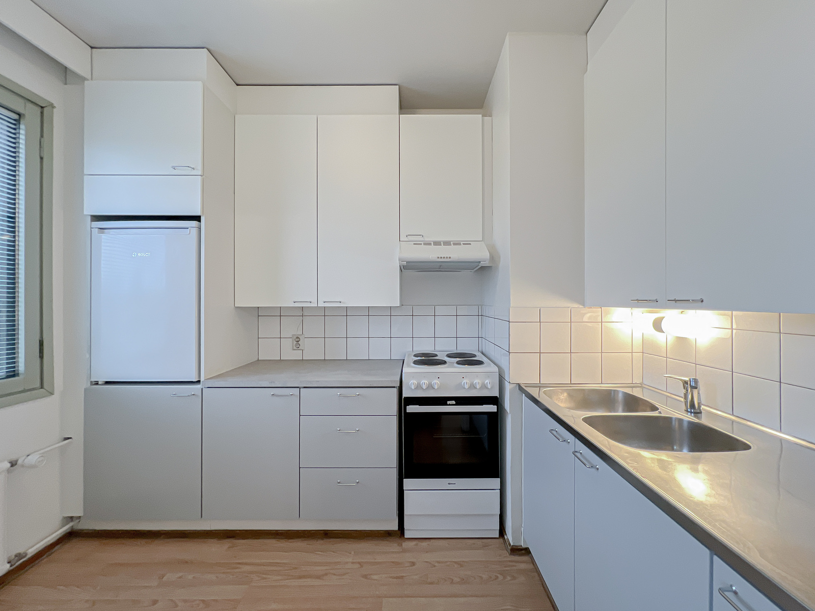 Keittiö on käytännöllinen ja tarjoaa runsaasti kaappitilaa sekä hyvin suunnitellut työskentelytilat, joten ruoanlaitto on helppoa ja miellyttävää. Makuuhuone on tilava ja sisältää kiinteät kaapistot, jotka helpottavat arkea. Lisäksi asunnosta löytyy vaatehuone, joka tuo reilusti lisää säilytystilaa.