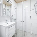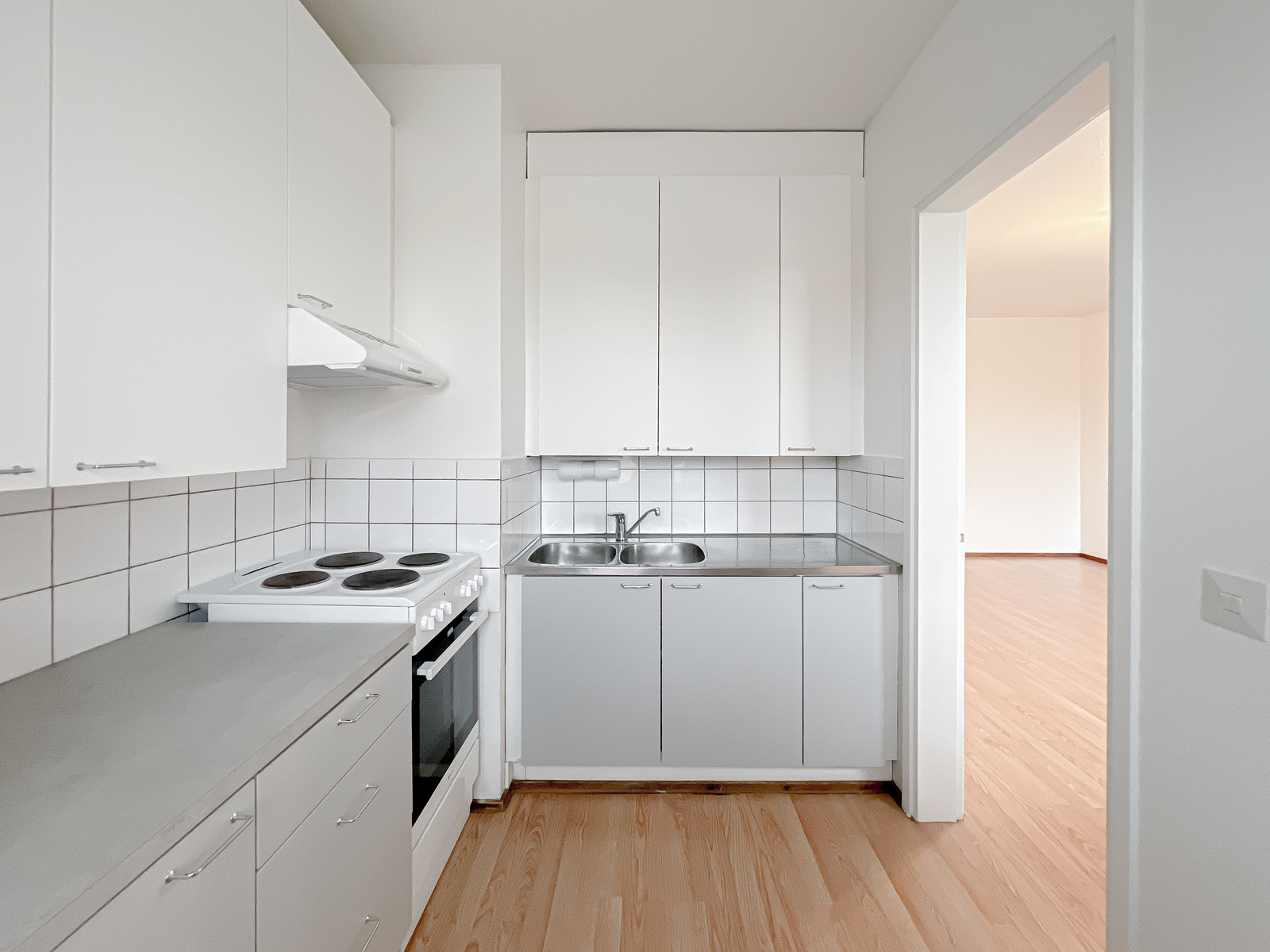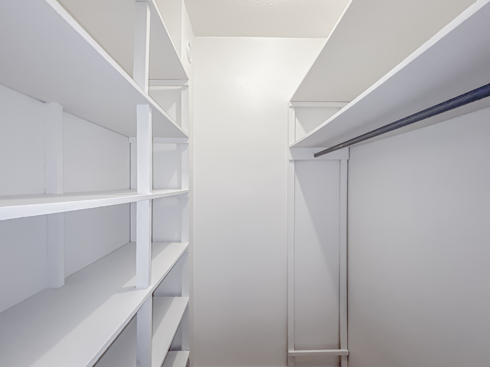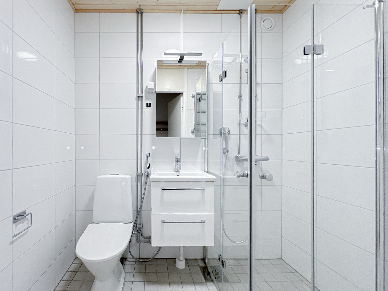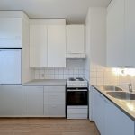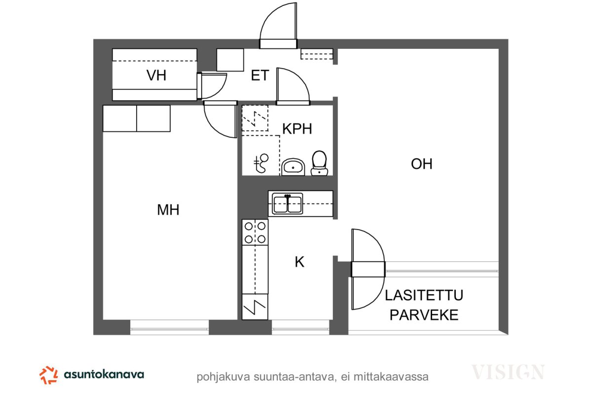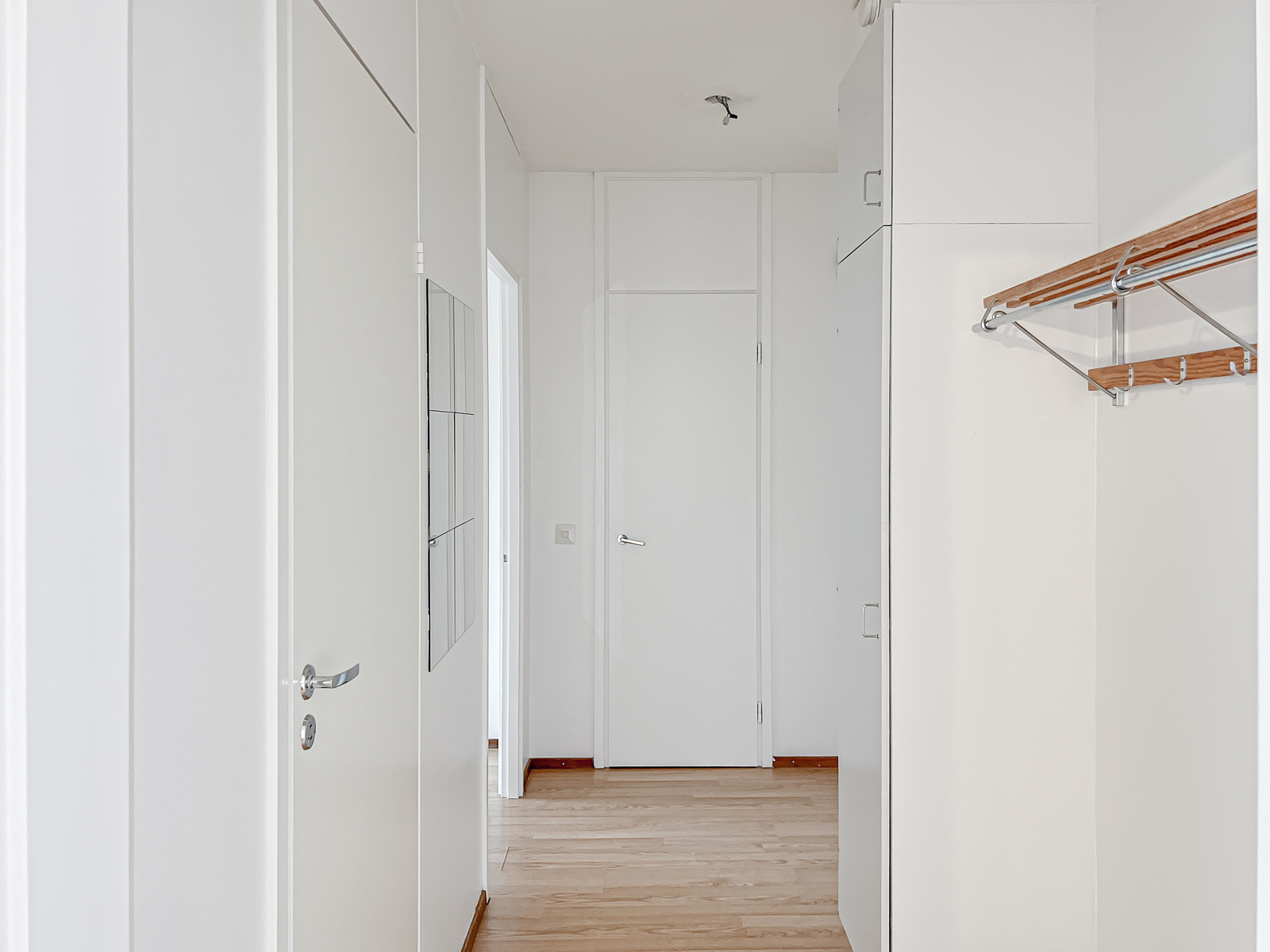 Keittiö on käytännöllinen ja tarjoaa runsaasti kaappitilaa sekä hyvin suunnitellut työskentelytilat, joten ruoanlaitto on helppoa ja miellyttävää. Makuuhuone on tilava ja sisältää kiinteät kaapistot, jotka helpottavat arkea. Lisäksi asunnosta löytyy vaatehuone, joka tuo reilusti lisää säilytystilaa.