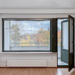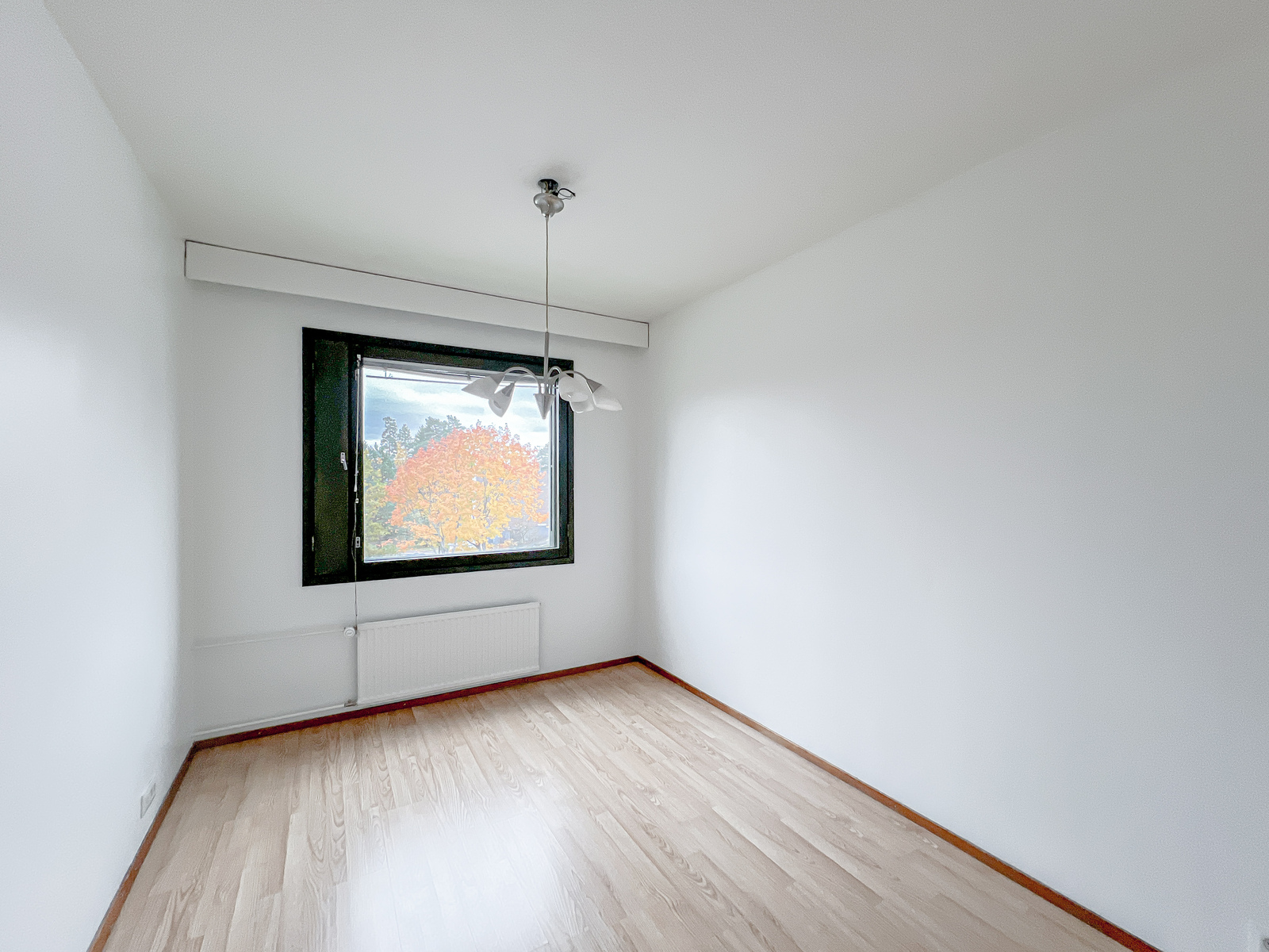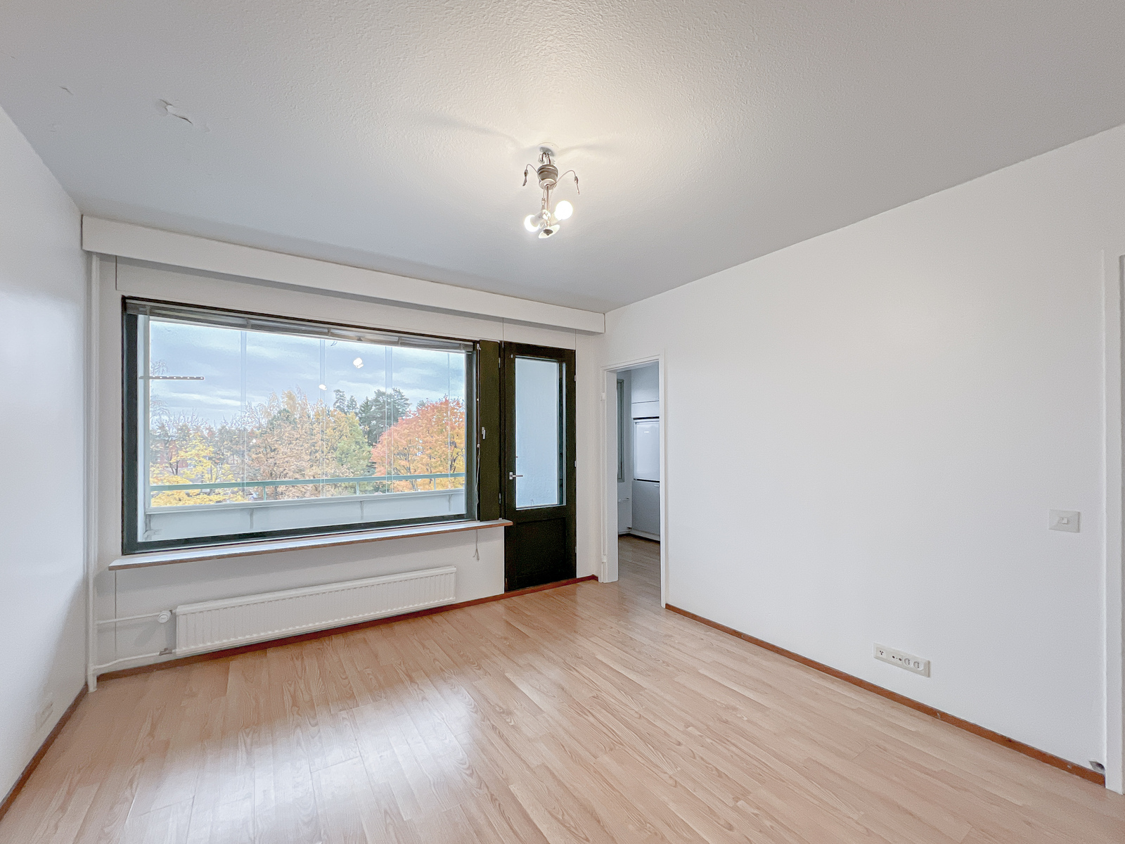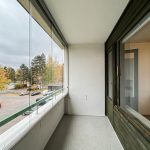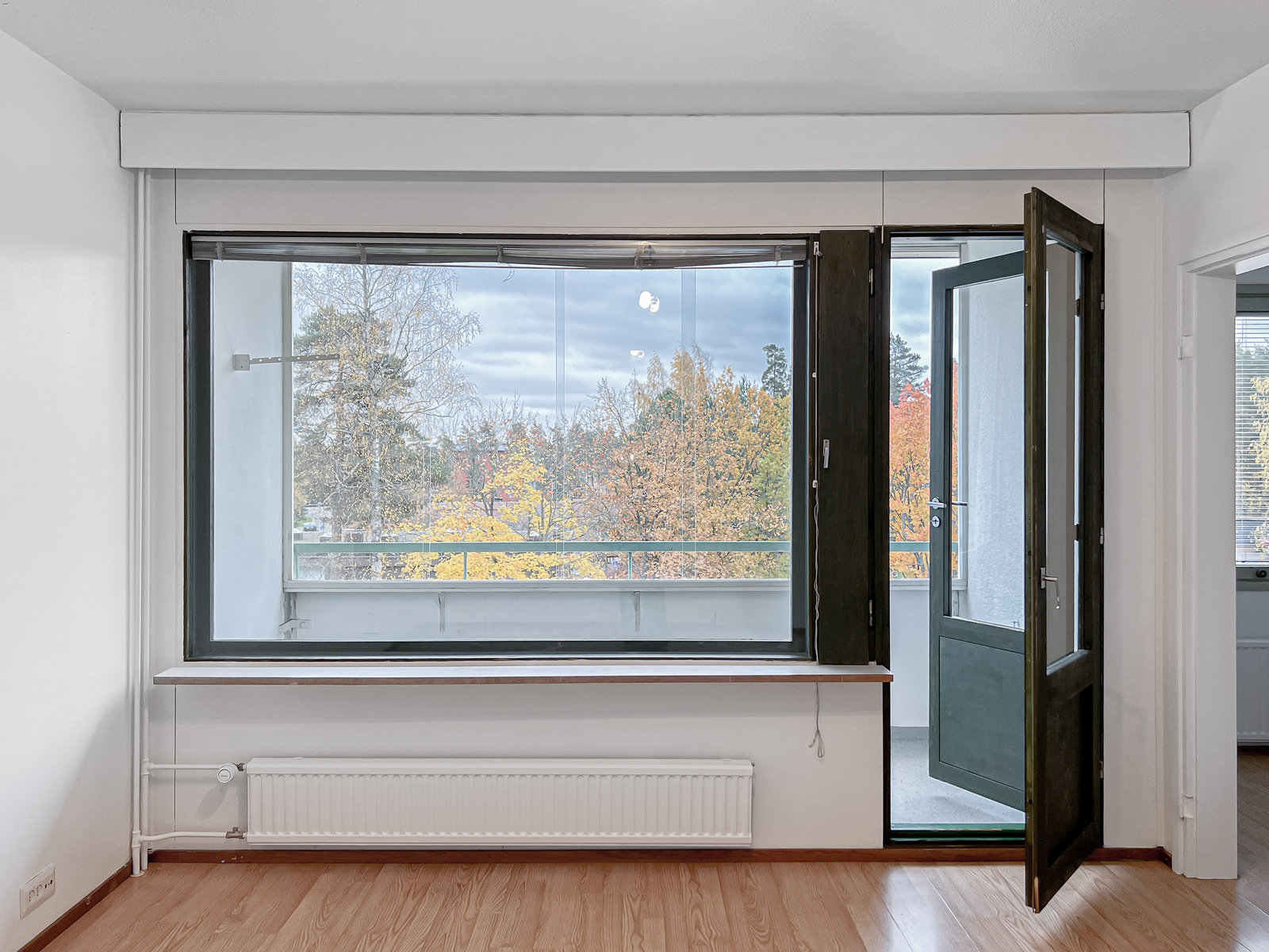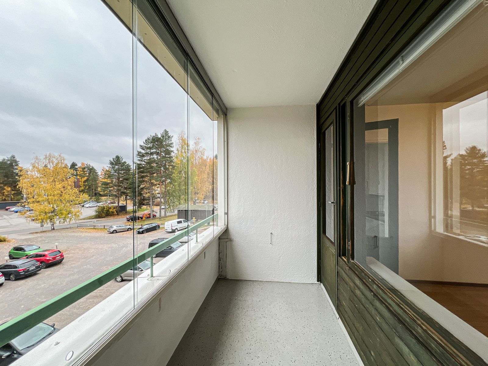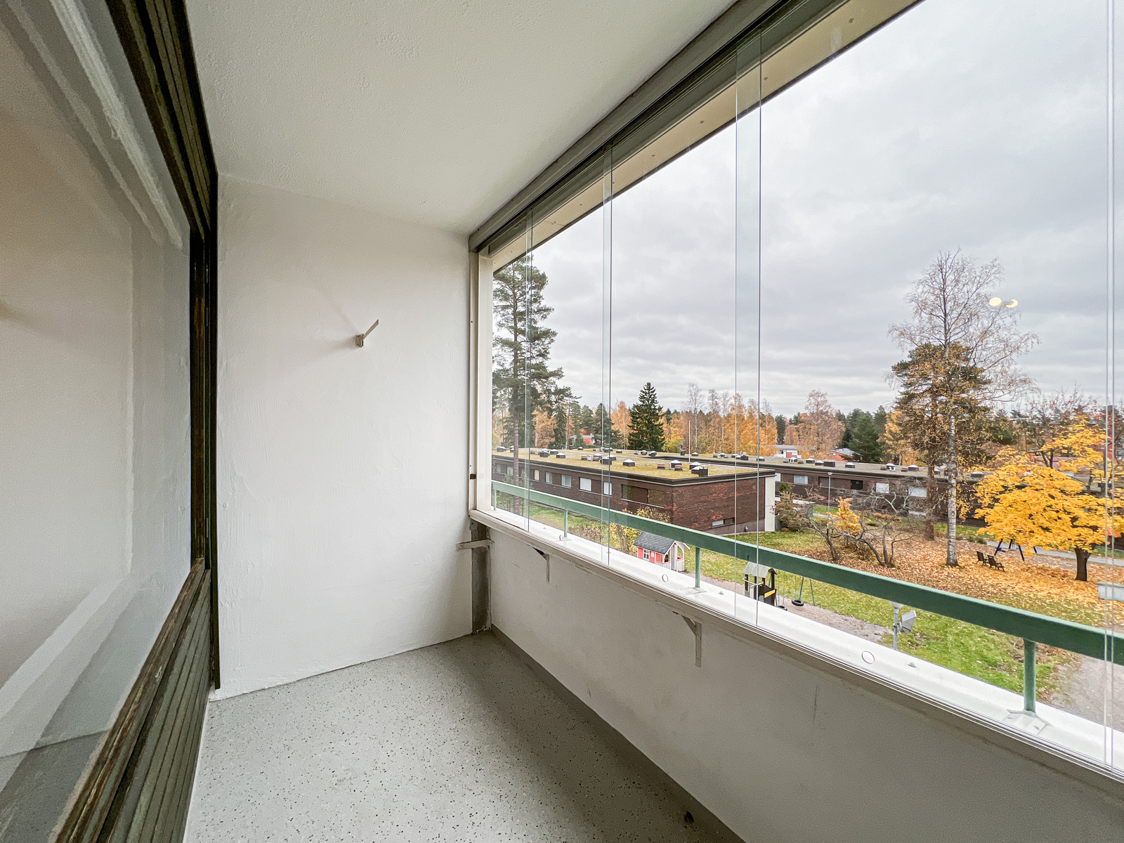 Olohuone on reilun kokoinen ja sen suuresta ikkunasta avautuu kauniin vehreät maisemat, tuoden luonnonvaloa sisään. Asunnon lasitettu parveke tarjoaa mukavan tilan rentoutumiseen alkukeväästä pitkälle syksyyn saakka.