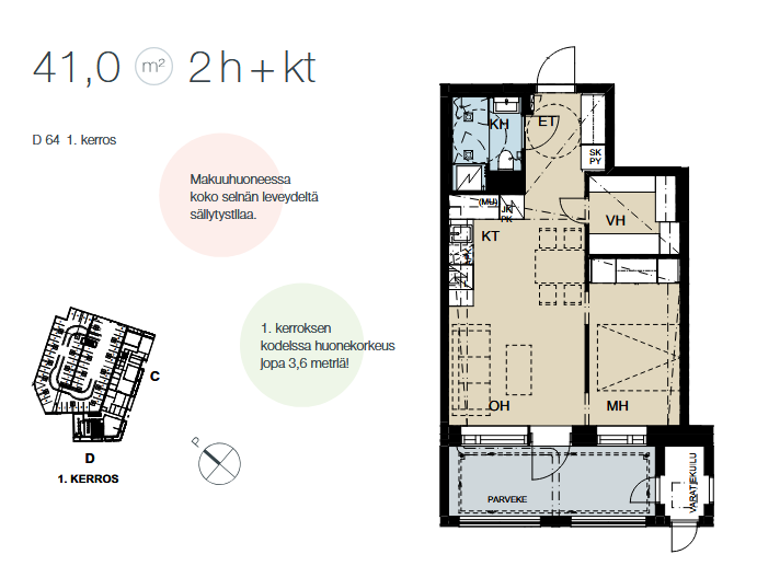| Taloyhtiössä muuta | Elisa Taloyhtiölaajakaista 25M Jätetilat C-portaan 1. kerroksessa. Autohalli, jonne pääsee omasta kotikerroksesta hissillä. Talon vesikatolla on aurinkopaneeleita, joiden tuottama sähkö käytetään mahdollisuuksien mukaan kiinteistön laitteiden kuluttamaan sähköön. Rakennuksessa on lämmöntalteenotolla varustettu huoneistokohtainen tulo- ja poistoilmanvaihtolaitteisto, jota voidaan säätää liesikuvulta. Huoneistokohtainen LTO-laite on kytketty yhtiön sähköön. |