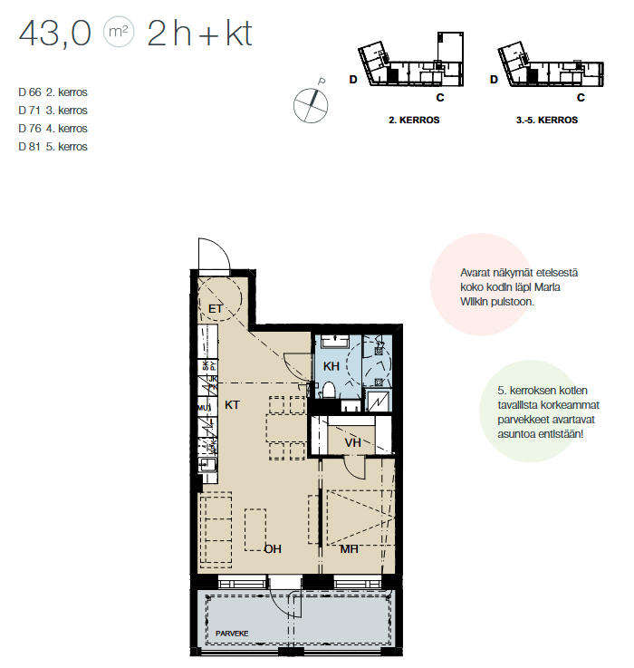 Vuokrattavana uusi kaksio taloyhtiön toisesta (2/5) kerroksesta Helsingin Kuninkaantammessa. Tyylikkäät ja ajattomat materiaalit, mm. integroidut kodinkoneet. Huoneistosta on avarat näkymät eteisestä koko kodin läpi Maria Wiikin puistoon. Eteisestä löytyy kaappitilaa ja makuuhuoneesta tilava vaatehuone tehokkaaseen säilytykseen. Huoneiston kruunaa suuri, tilava lasitettu parveke. Mahdollisuus vuokrata autohallipaikka 80€/kk.