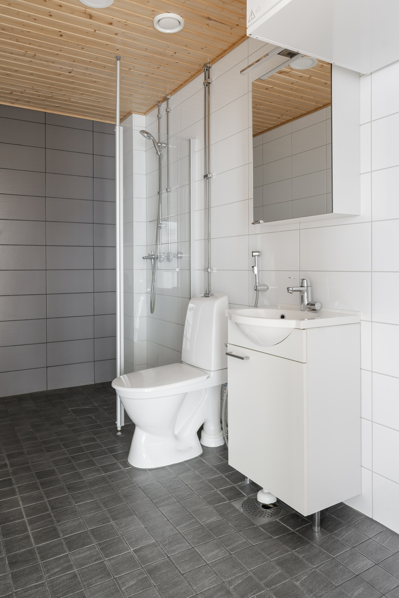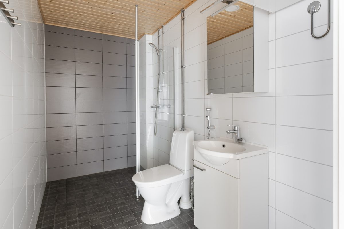 • Varusteet: suihkuseinä, pesukoneliitäntä, lattialämmitys, wc-istuin, suihku, peilikaappi