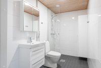 • Varusteet: suihkuseinä, pesukoneliitäntä, lattialämmitys, wc-istuin, suihku, peilikaappi, kiinteät valaisimet