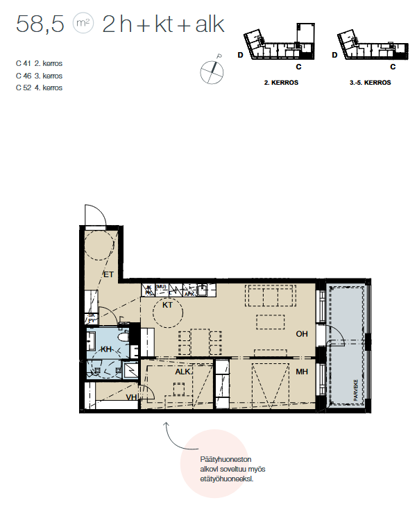 | Yhteensä m² | 58.5 m² |