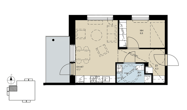 | Huoneistoselitelmä | 2h+kt+parveke (lasitettu) |