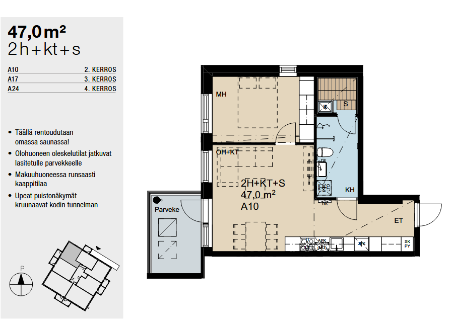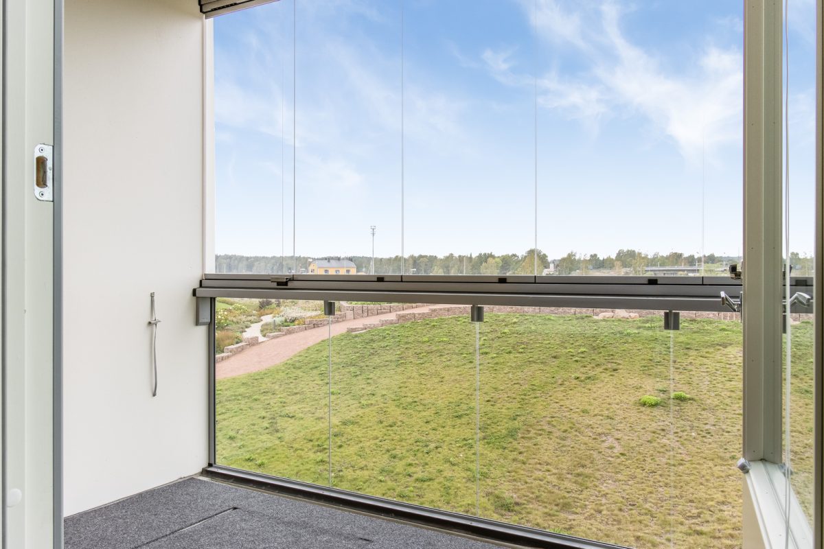 Tästä kodista löytyy kaikki tarpeellinen – mainiot säilytysratkaisut, oma lasitettu parveke sekä rentouttava sauna. Olohuoneen oleskelutilat jatkuvat lasitetulle parvekkeelle, jossa voit nauttia vaikkapa aamukahvit. Upeat puistonäkymät kruunaavat kodin tunnelman. Asunnon yhteydessä vuokrataan autopistokepaikka 25€/kk.