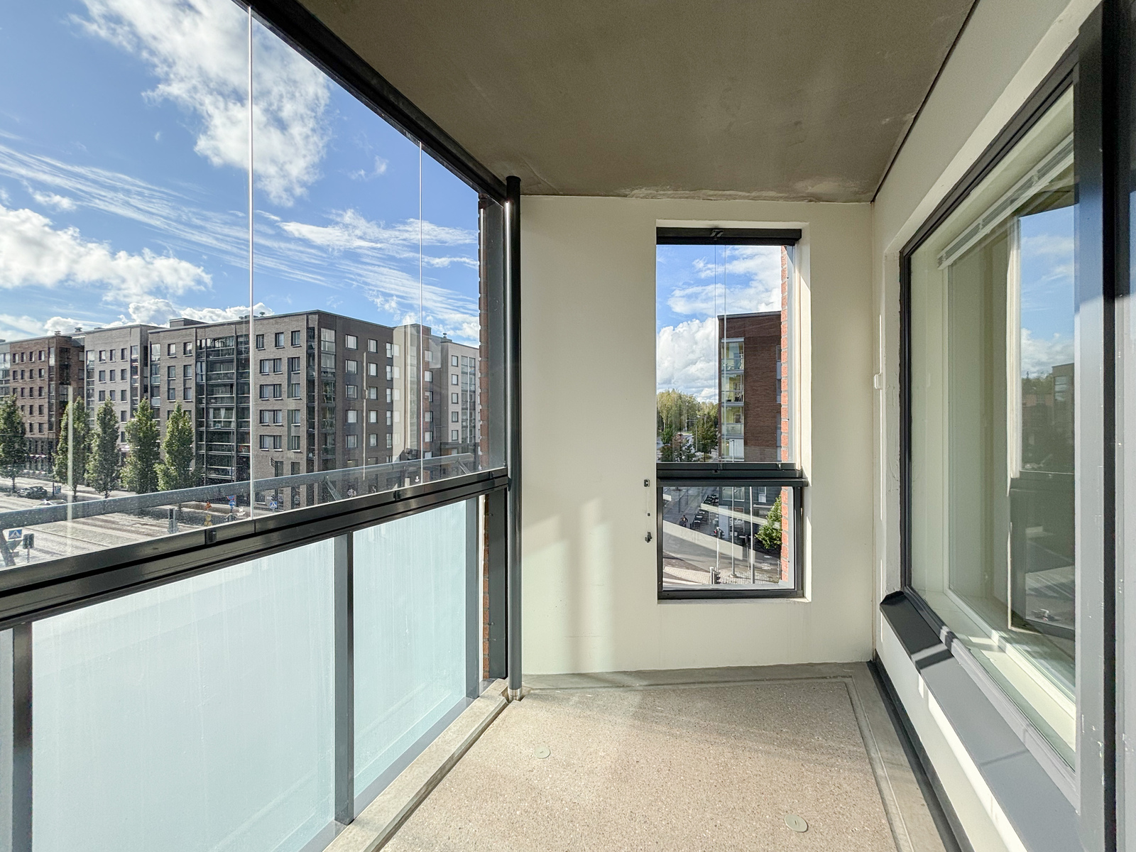 Tässä valoisassa kodissa viihdyt varmasti. Asunnossa on kaksi makuuhuonetta, joissa hyvin säilytystilaa. Keittiö on erotettu olohuoneesta fiksusti väliseinällä, joka antaa olohuoneelle enemmän sisukseen vaihtoehtoja. Olohuoneeseen mahtuu isompi sohva, sekä ruokailuryhmä ja täältä on kulku lasitetulle parvekkeelle, johon voit sisustaa oman oleskelutilan. Asunnolla on kylpyhuone, jossa paikka omalle pyykinpesukoneelle ja erillinen wc-tila.