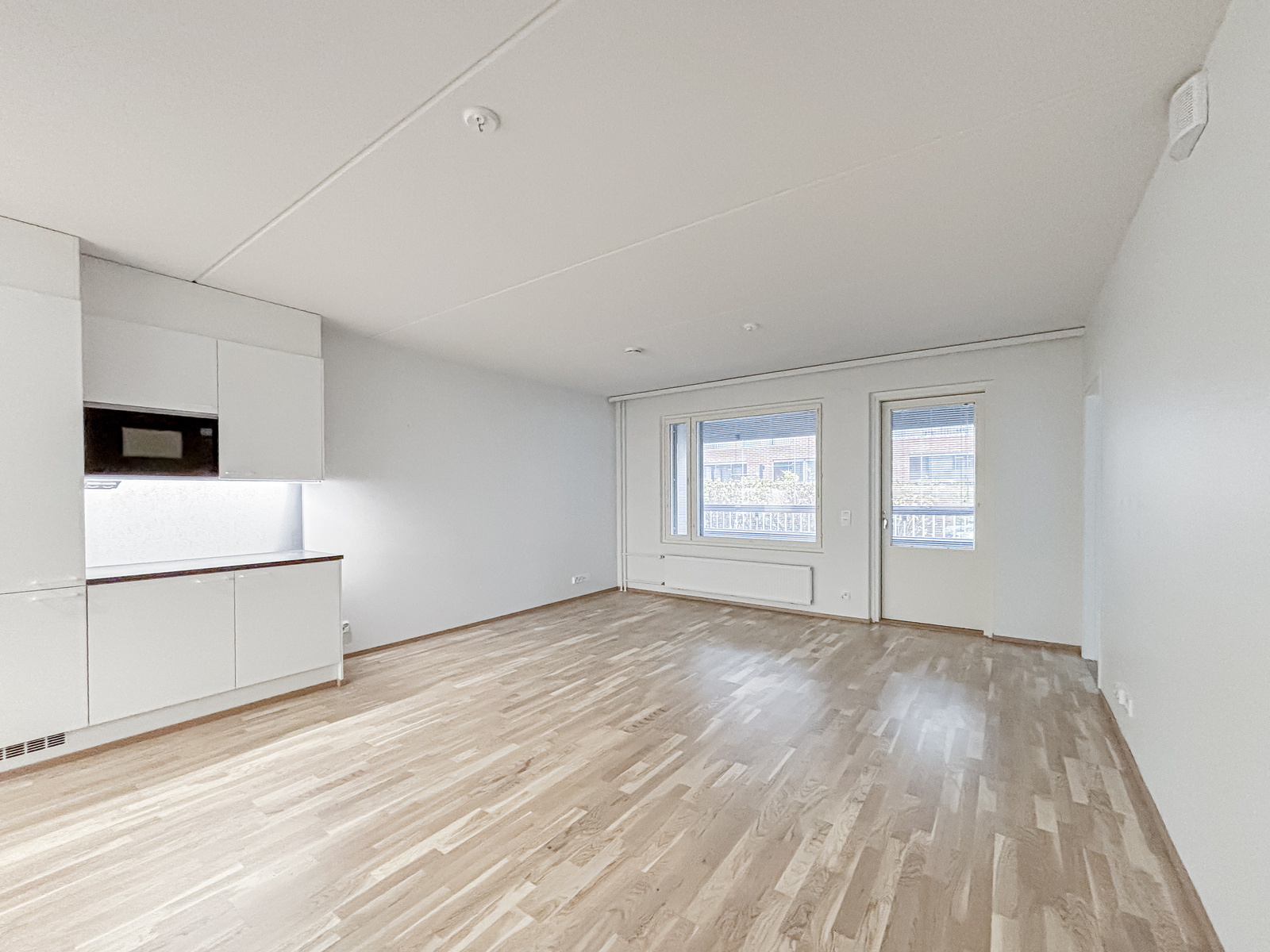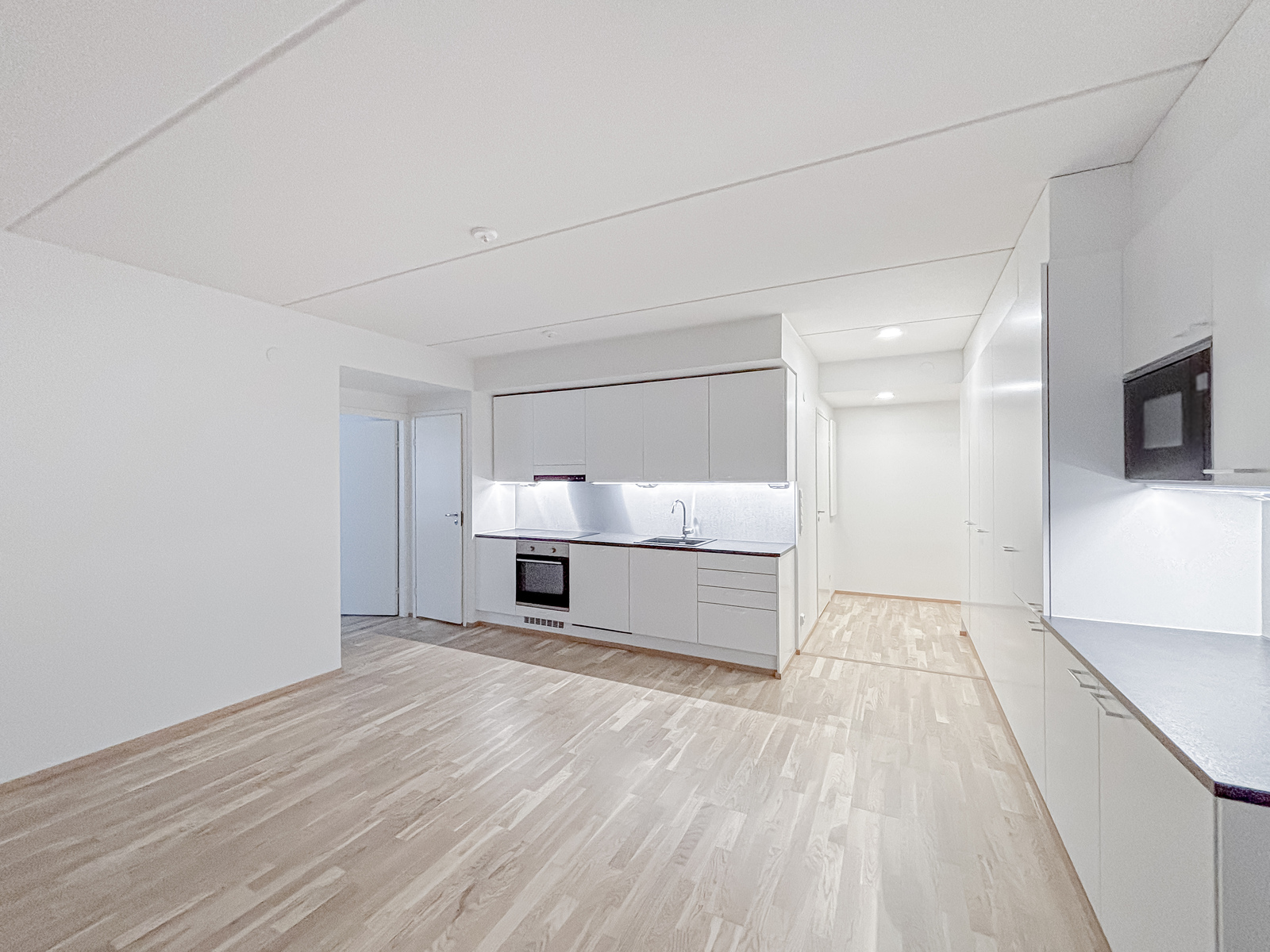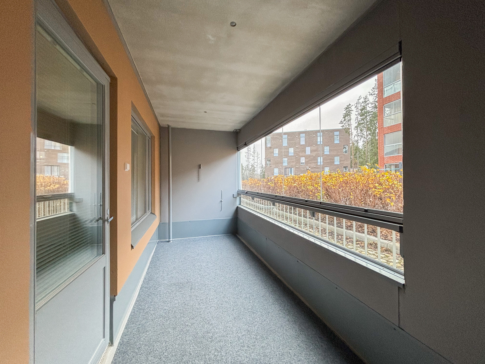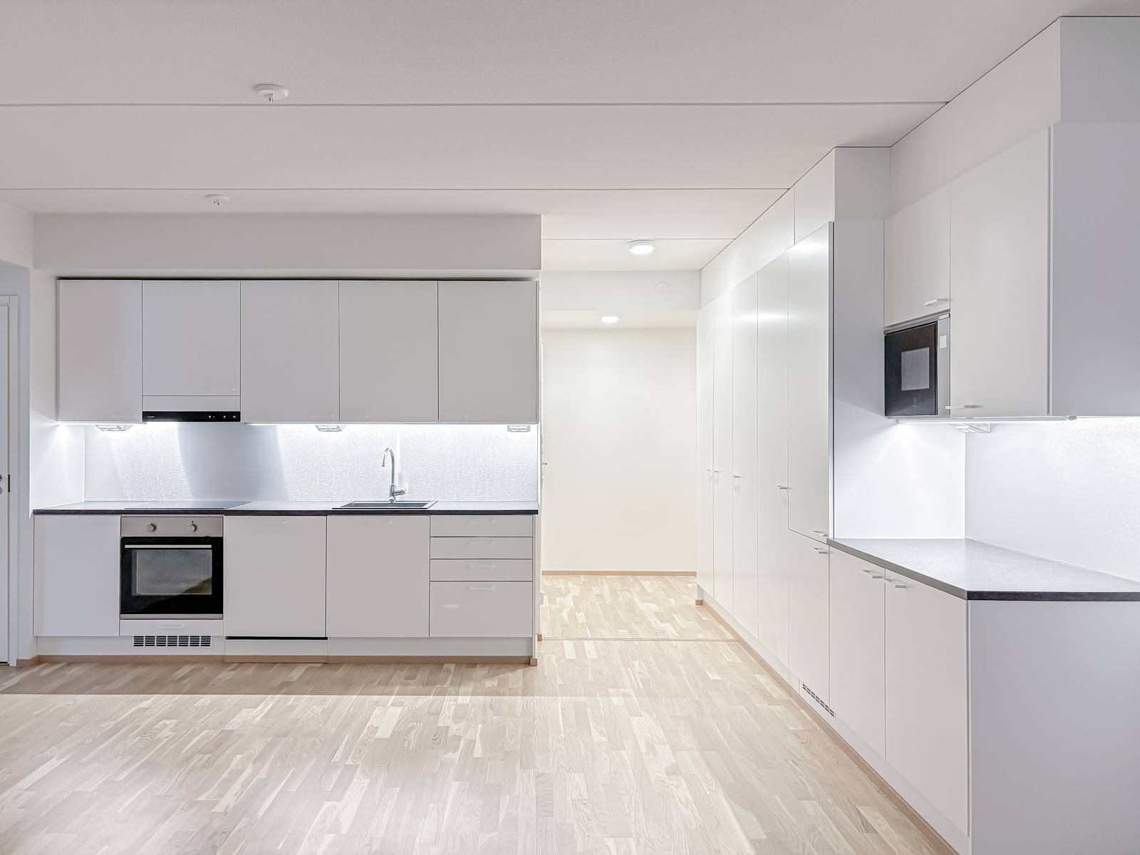 Tässä ensimmäisen kerroksen asunnossa on selkeä pohjaratkaisu ja tyylikkäät pinnat, jotka mahdollistavat asunnon helpon sisustamisen mieleiseksi. Tyylikäs avokeittiö on toimiva ja sieltä löytyy kaikki tarvittava. Säilytystilaa on kivasti mm. vaatehuoneen muodossa. Asunnon kruunaa koko asunnon levyinen lasitettu parveke, jossa kelpaa juoda vaikkapa aamukahvit. Kylpyhuoneesta löytyy pesukoneliitäntä, joka on kätevästi kätketty kaapin sisälle.