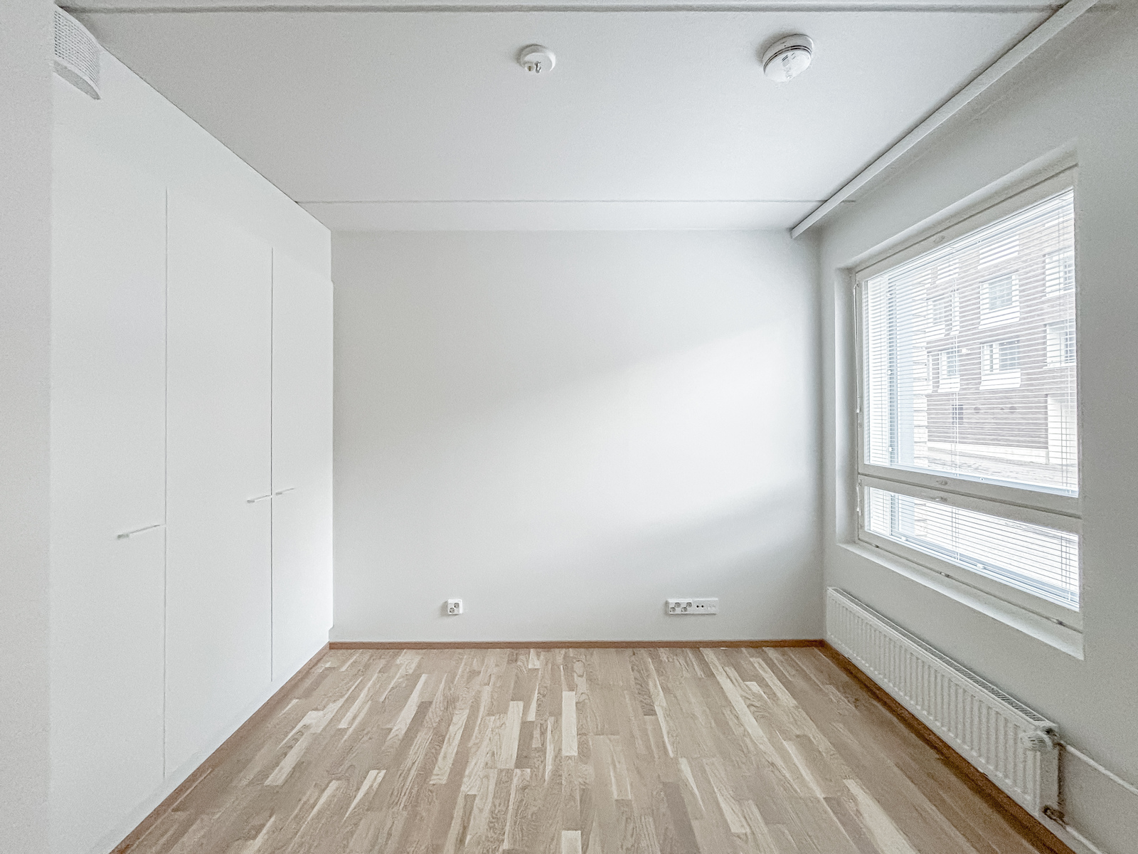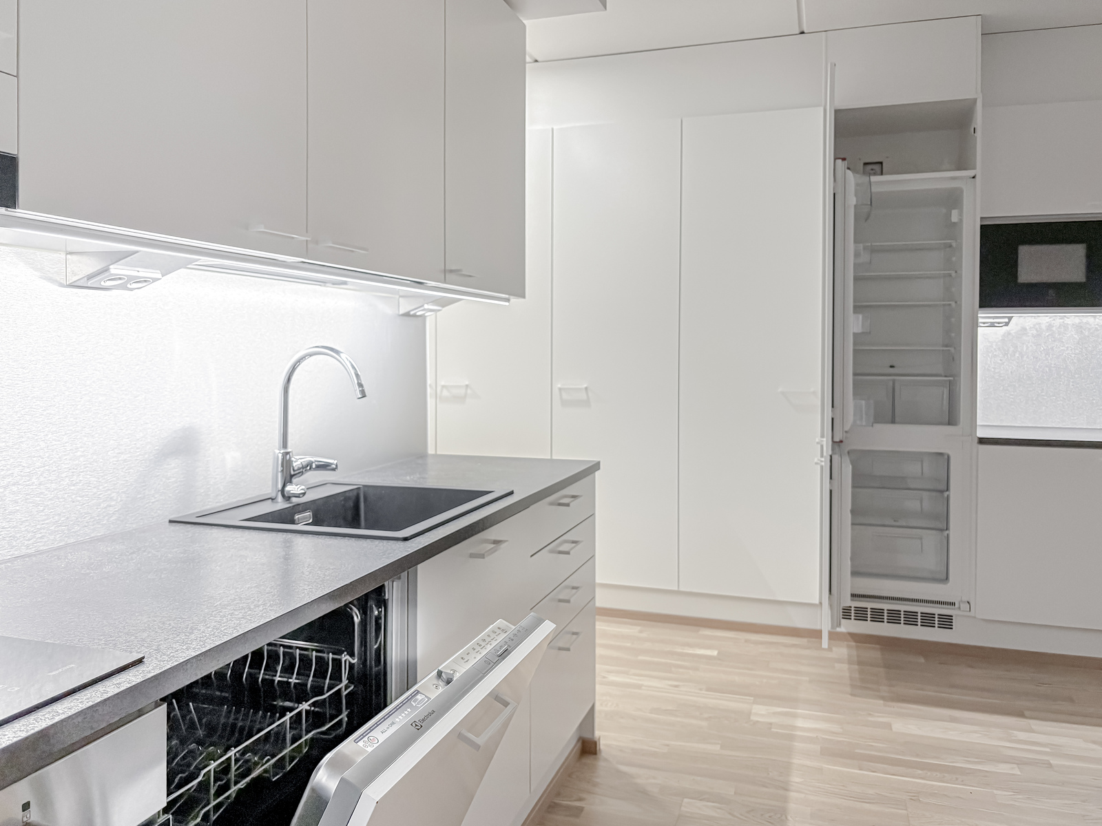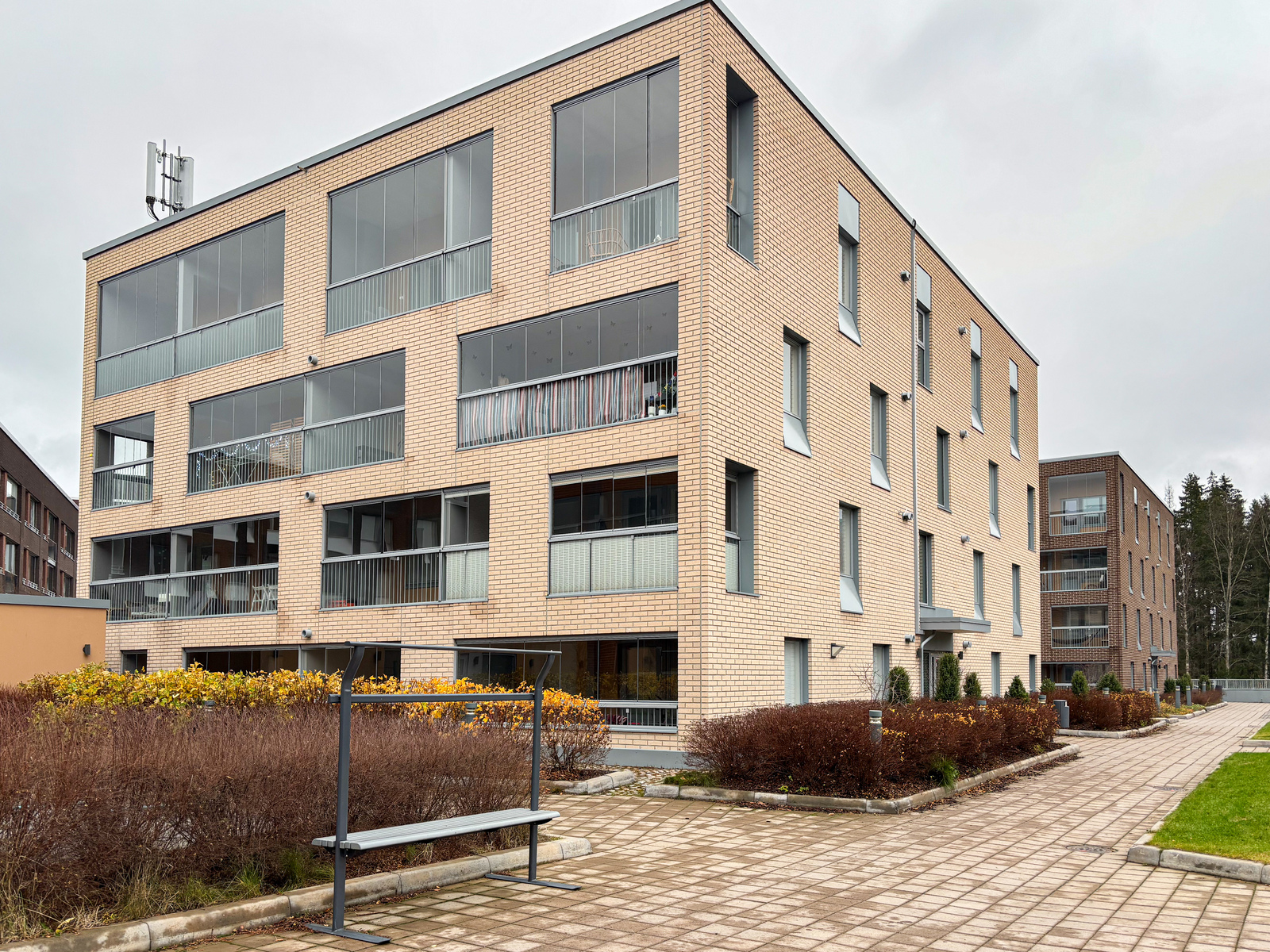 Tässä ensimmäisen kerroksen asunnossa on selkeä pohjaratkaisu ja tyylikkäät pinnat, jotka mahdollistavat asunnon helpon sisustamisen mieleiseksi. Tyylikäs avokeittiö on toimiva ja sieltä löytyy kaikki tarvittava. Säilytystilaa on kivasti mm. vaatehuoneen muodossa. Asunnon kruunaa koko asunnon levyinen lasitettu parveke, jossa kelpaa juoda vaikkapa aamukahvit. Kylpyhuoneesta löytyy pesukoneliitäntä, joka on kätevästi kätketty kaapin sisälle.