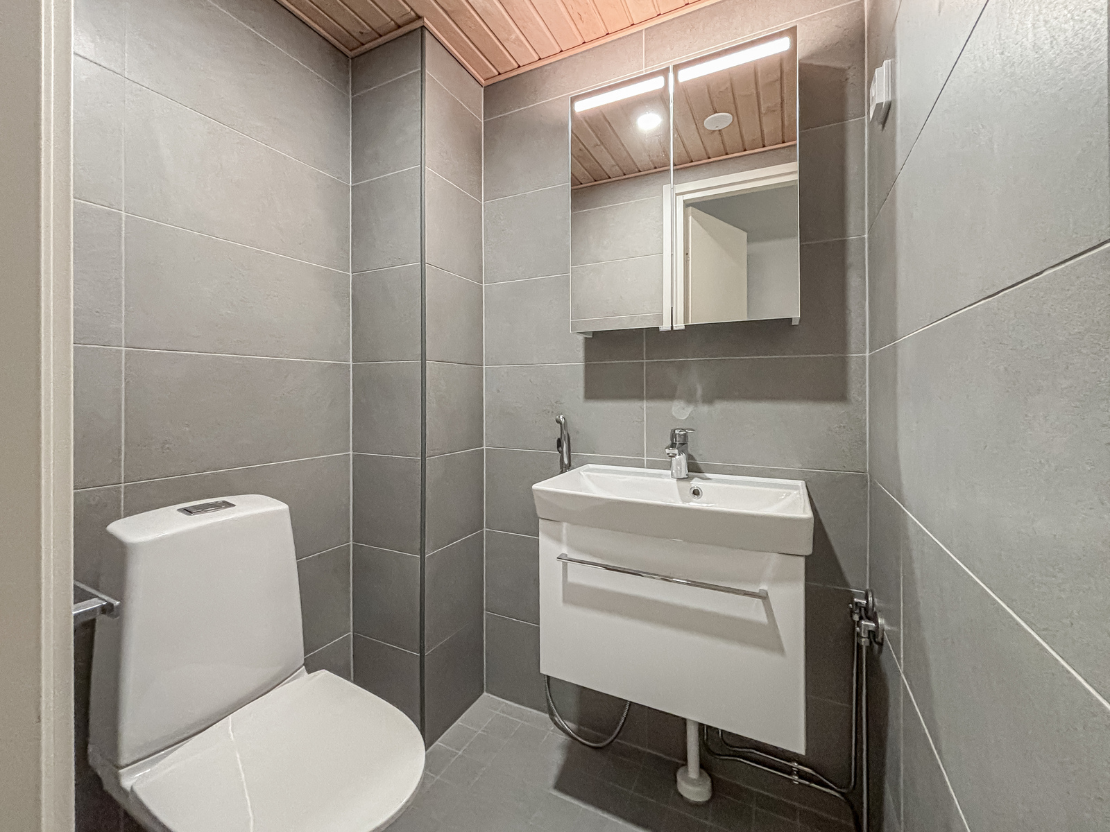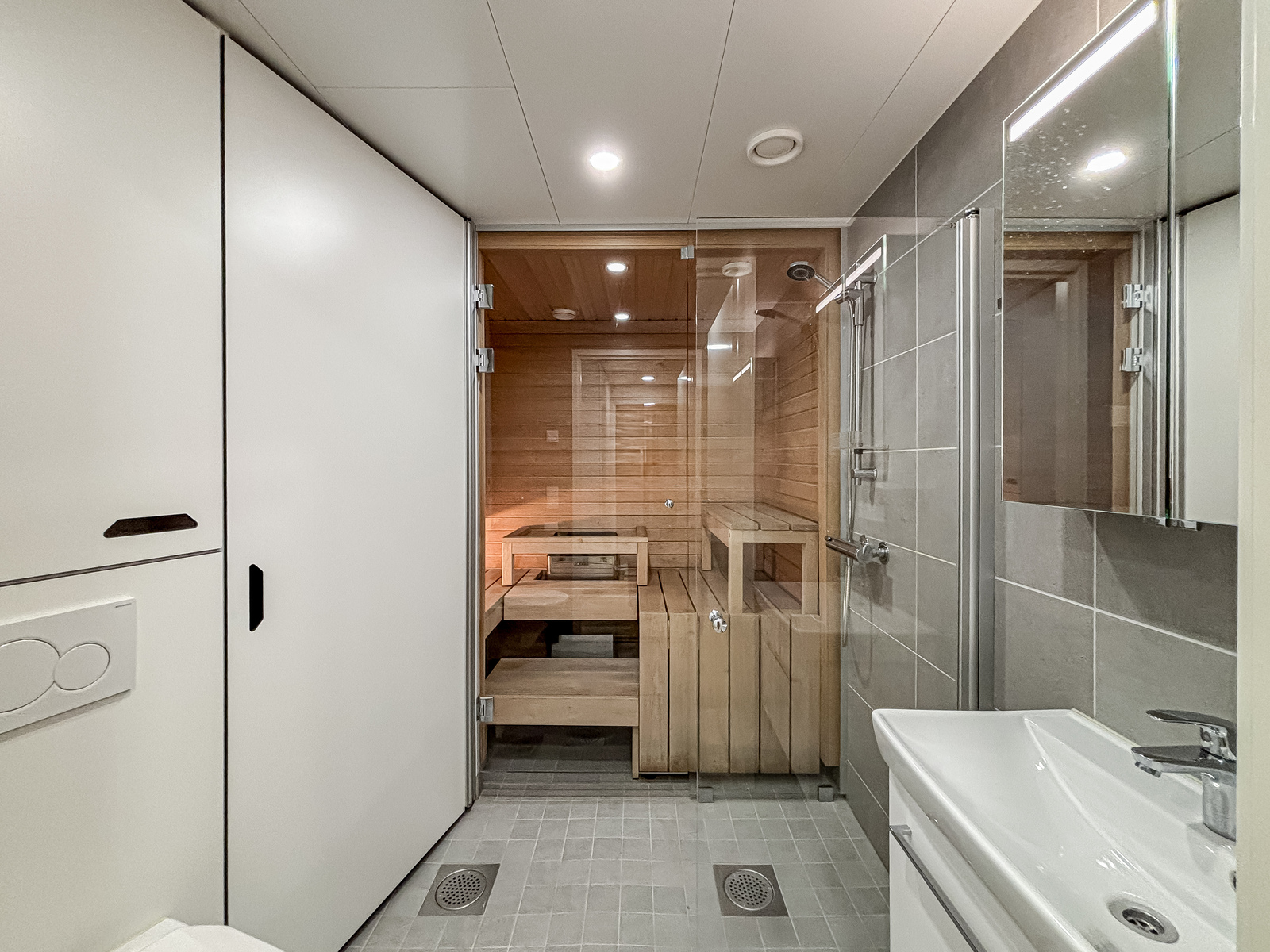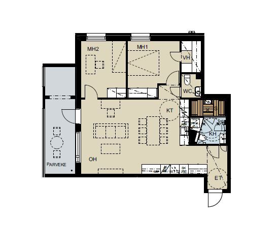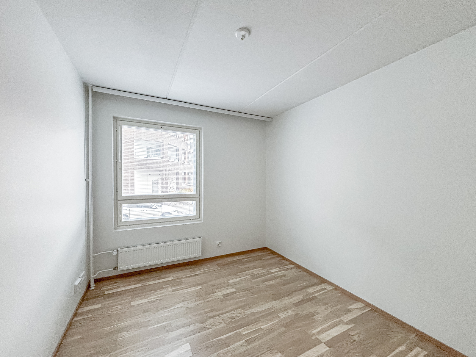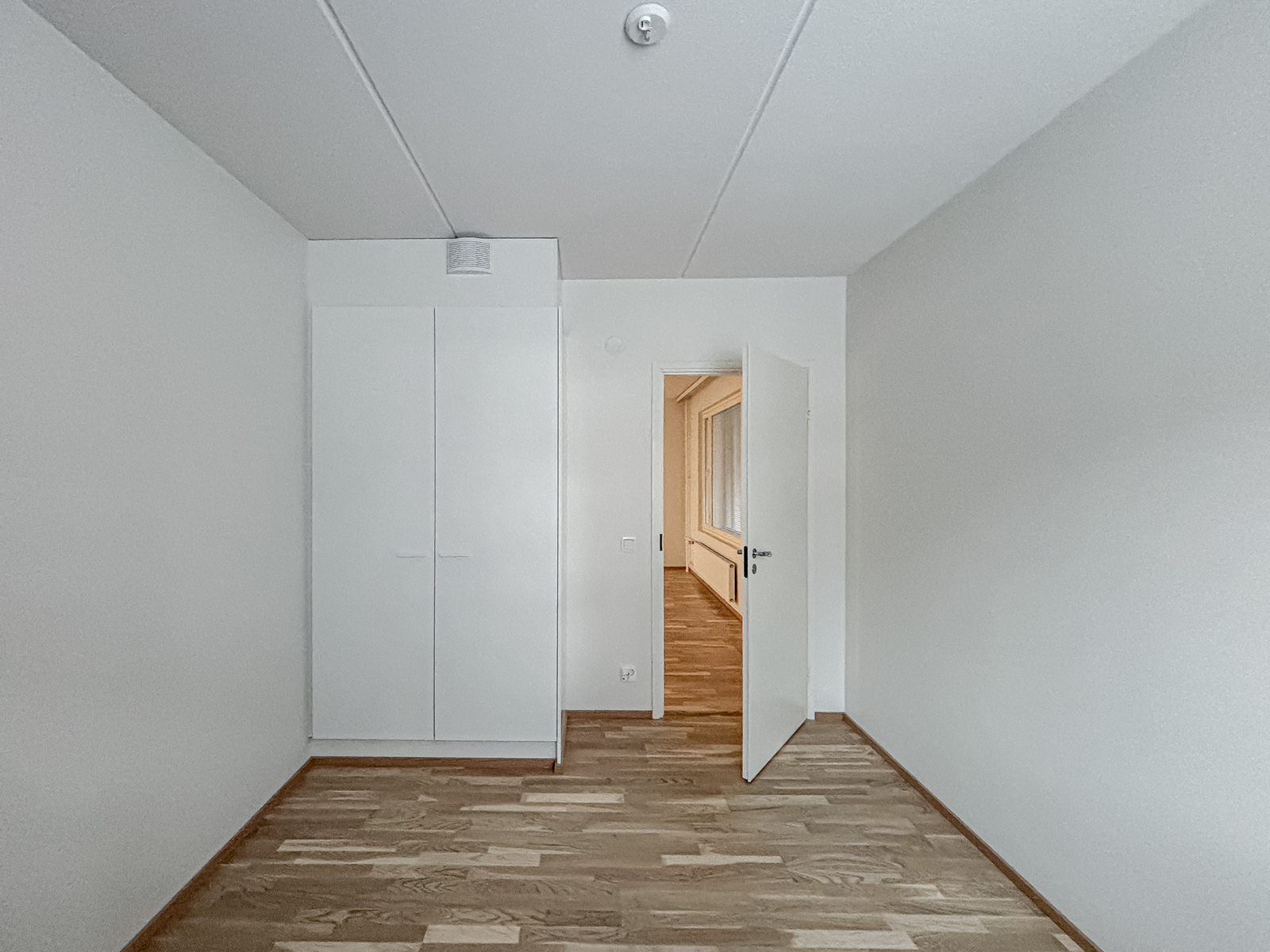 Tässä ensimmäisen kerroksen asunnossa on selkeä pohjaratkaisu ja tyylikkäät pinnat, jotka mahdollistavat asunnon helpon sisustamisen mieleiseksi. Tyylikäs avokeittiö on toimiva ja sieltä löytyy kaikki tarvittava. Säilytystilaa on kivasti mm. vaatehuoneen muodossa. Asunnon kruunaa koko asunnon levyinen lasitettu parveke, jossa kelpaa juoda vaikkapa aamukahvit. Kylpyhuoneesta löytyy pesukoneliitäntä, joka on kätevästi kätketty kaapin sisälle.