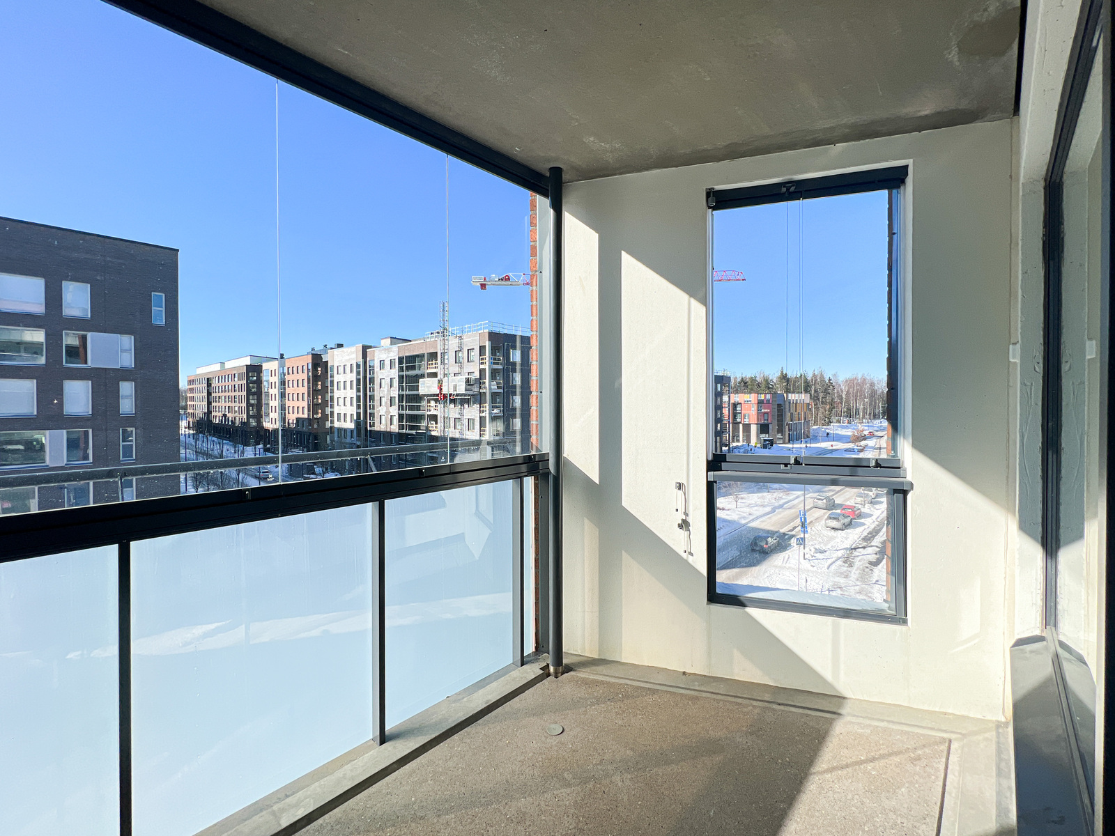 Tämän kodin sydämenä on tilava olohuone, josta aukeaa ikkunat kahteen suuntaan. Olohuoneesta on käynti lasitetulle parvekkeelle, josta aukeaa näkymät kadun puolelle. Keittiö on moderni ja varusteltu laadukkailla kodinkoneilla. Asunnossa on kaksi makuuhuonetta, sekä kylpyhuone ja erillinen wc.
