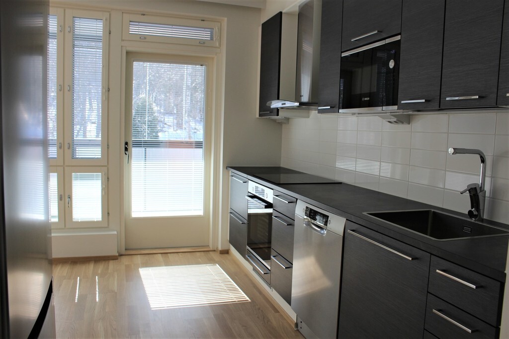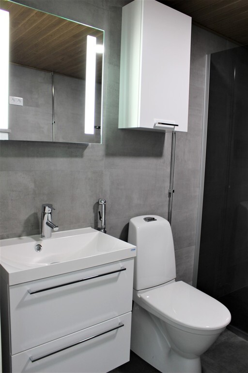 Keittiö on varustettu nykyaikaisilla kodinkoneilla (jääkaappi-pakastin, liesi/uuni, astianpesukone) ja kaappitilaa on runsaasti. Kylpyhuone on siisti ja tilava, pyykinpesukoneelle on liitäntä.