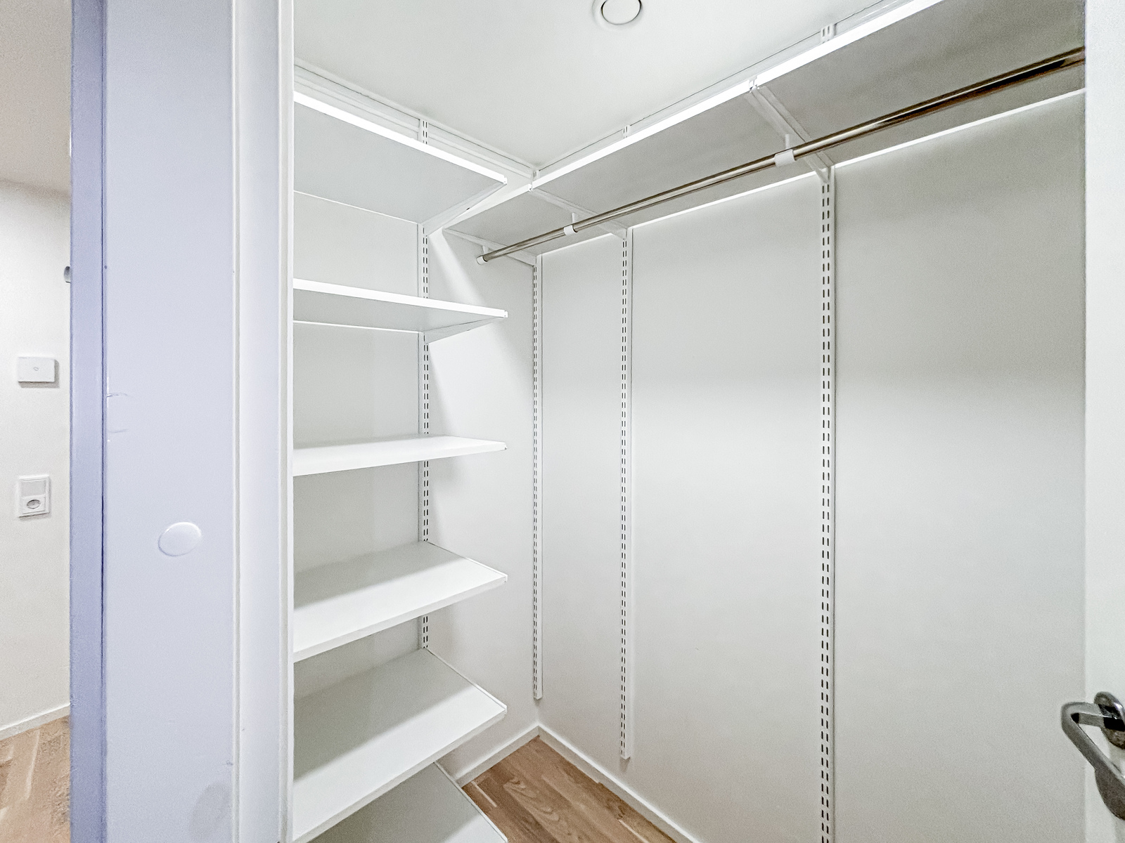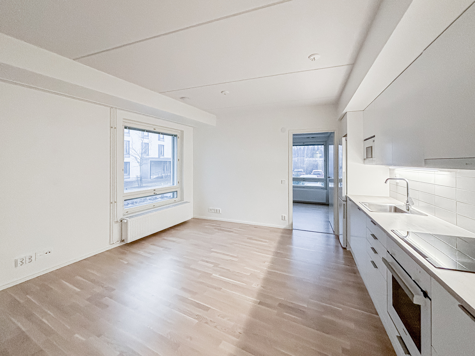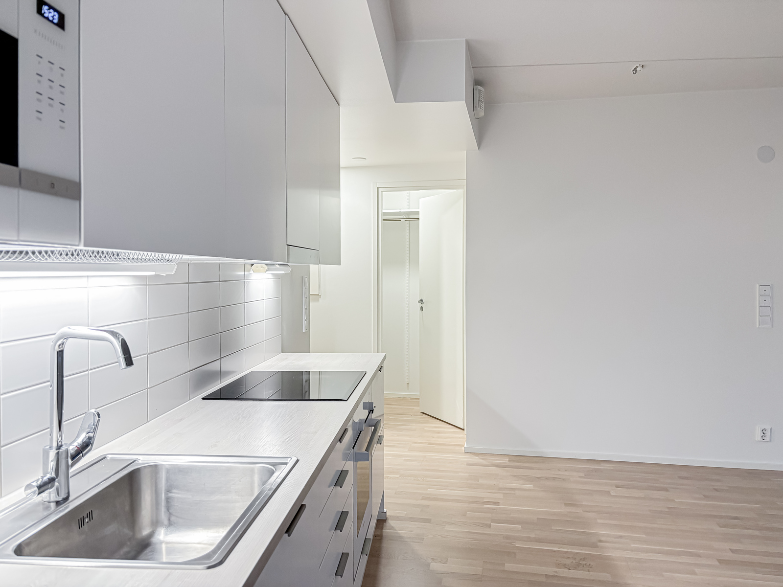 Tässä kodissa on kauniin valkea ja hyvin varusteltu avokeittiö, joka aukeaa luontevasti olohuoneen yhteyteen. Asunnossa on kaksi makuuhuonetta, sekä loistavat säilytystilat niin kiinteiden kaapistojen, kuin vaatehuoneenkin muodossa.