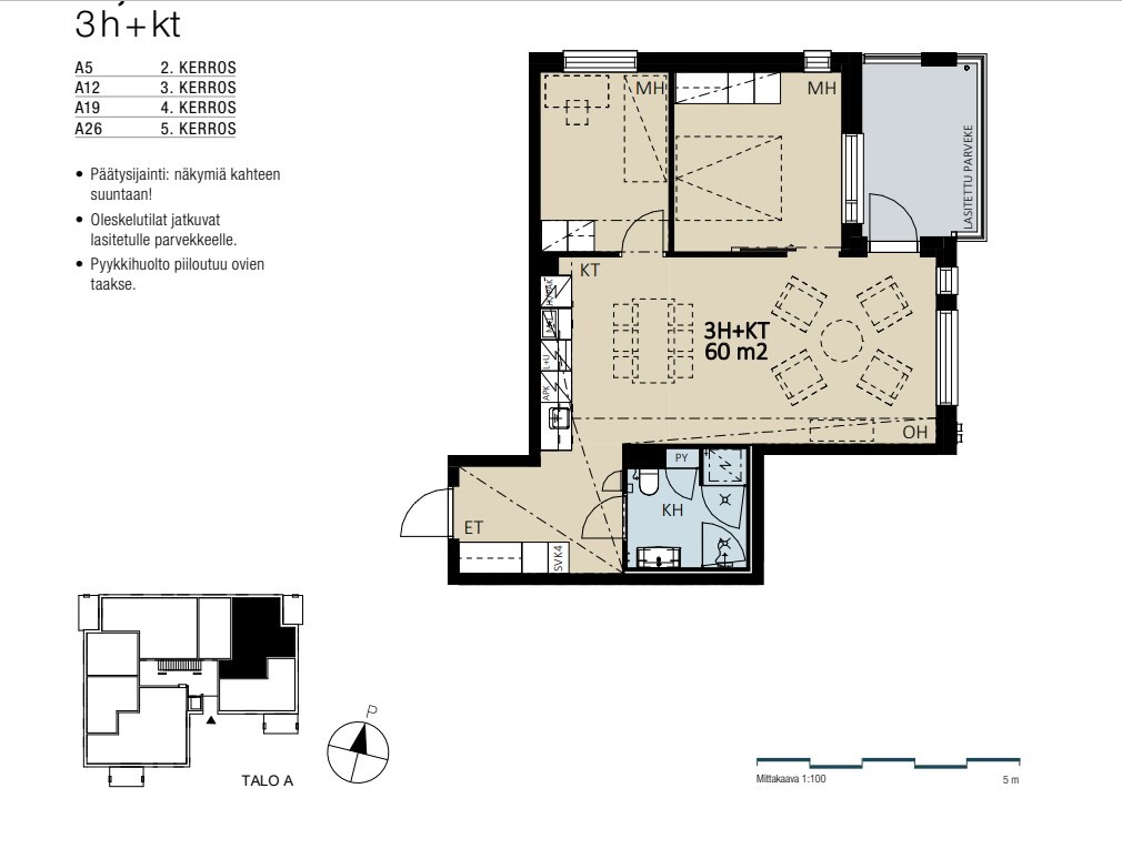 | Huoneistoselitelmä | 3h+kt+kph+lasitettu parveke |