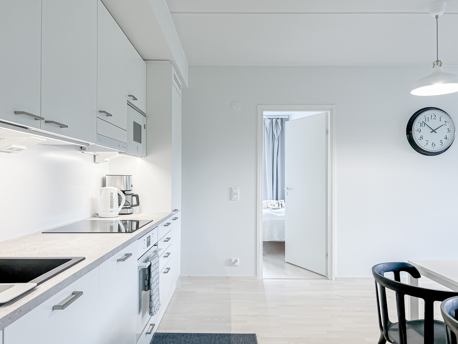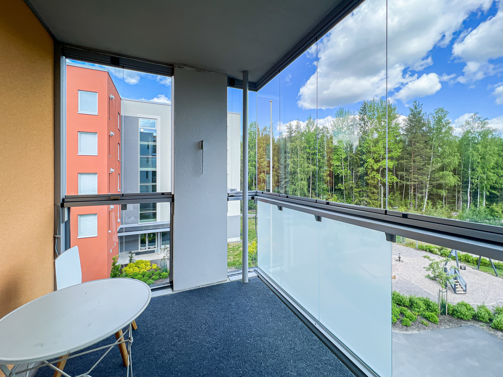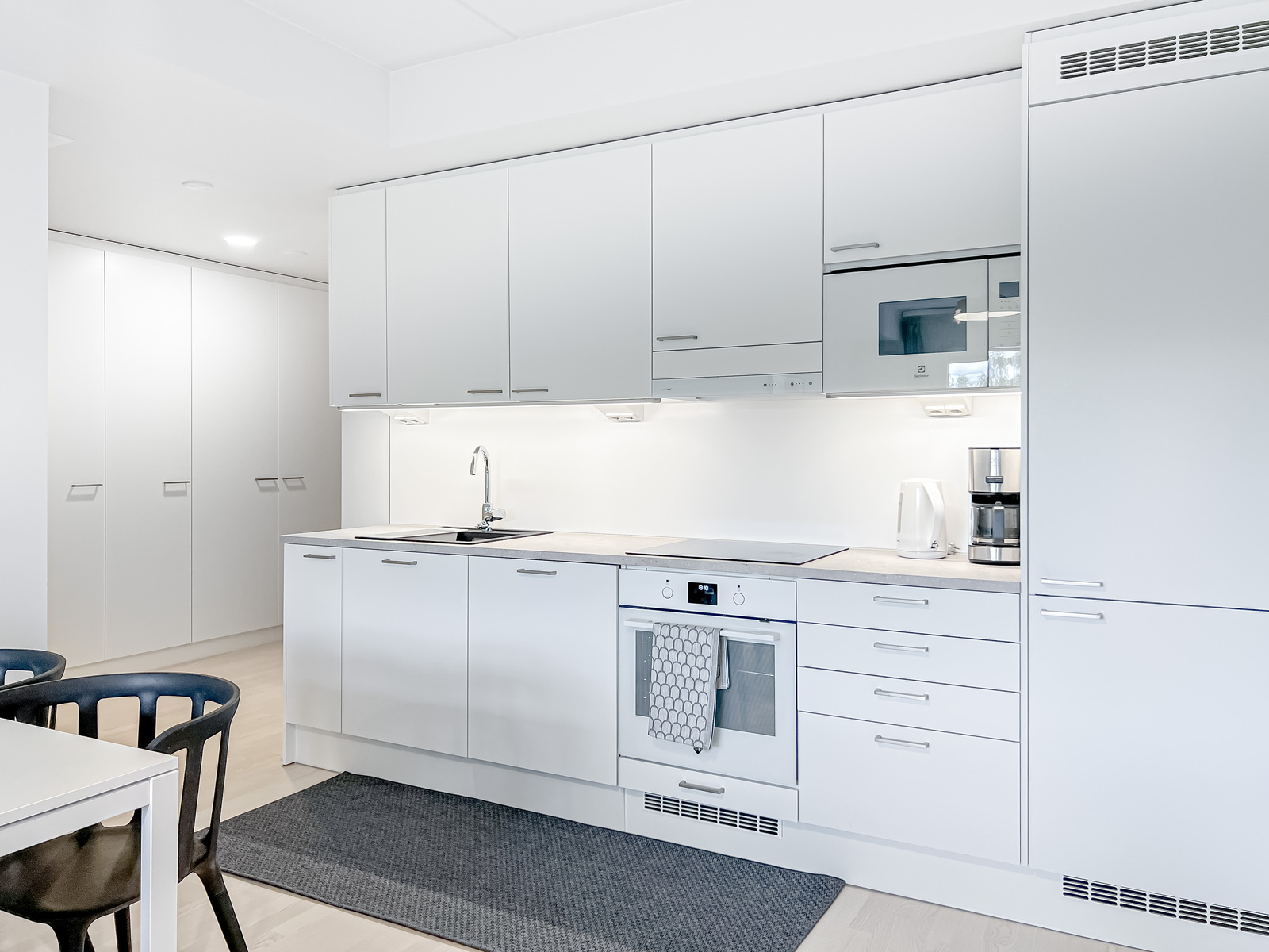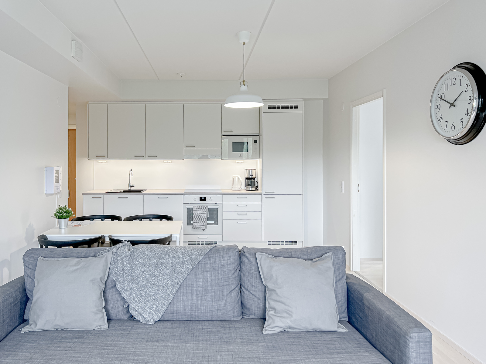 Olohuone ja keittiö muodostavat avonaisen oleskelutilan yhdessä olemiseen. Modernissa avokeittiössä, joka on kuin tyylikäs sisustuselementti itsessään, on integroidut ja laadukkaat kodinkoneet. Asunnossa on kaksi mukavan kokoista makuuhuonetta, sekä lasitettu parveke vehrein näkymin.