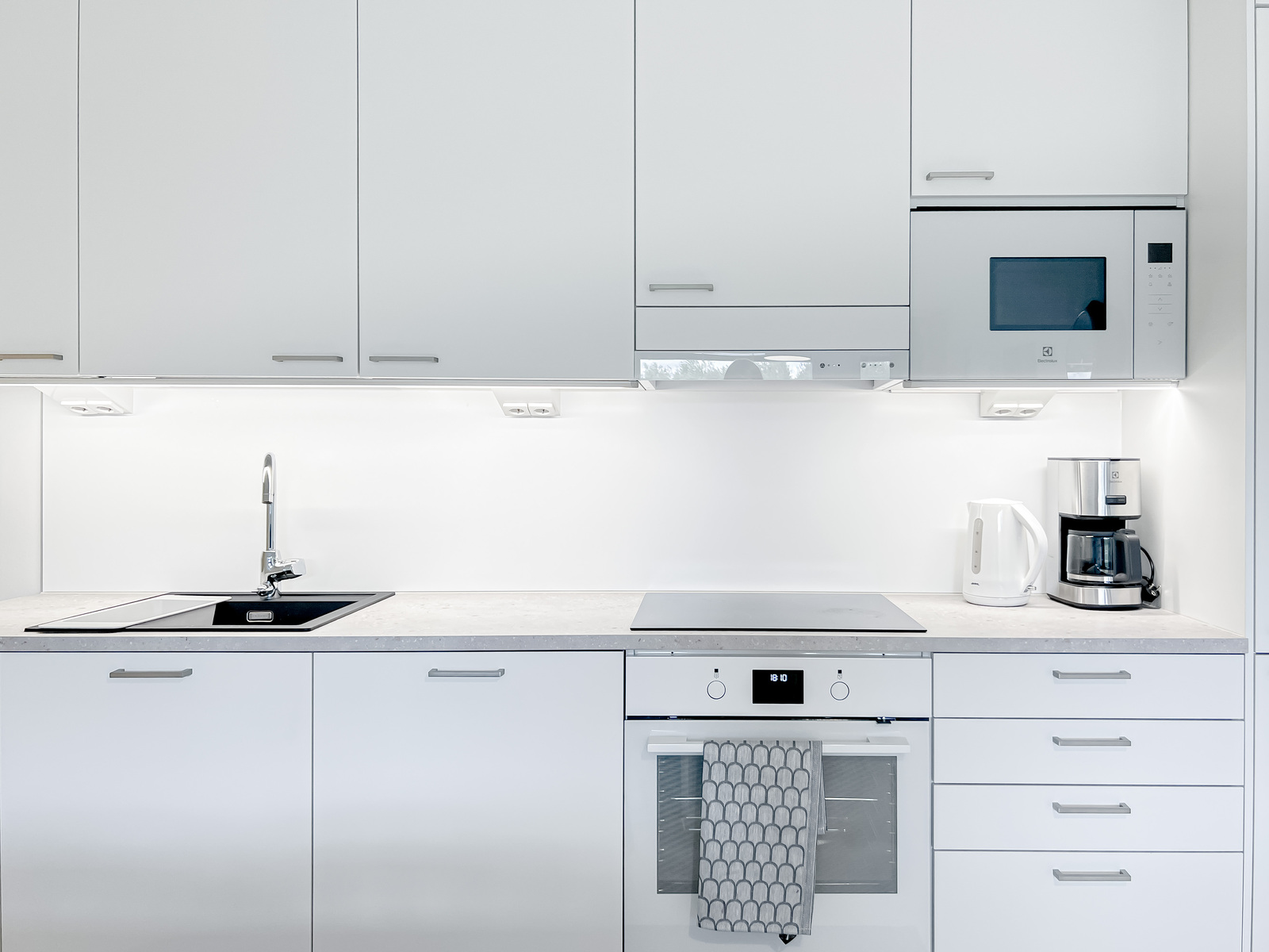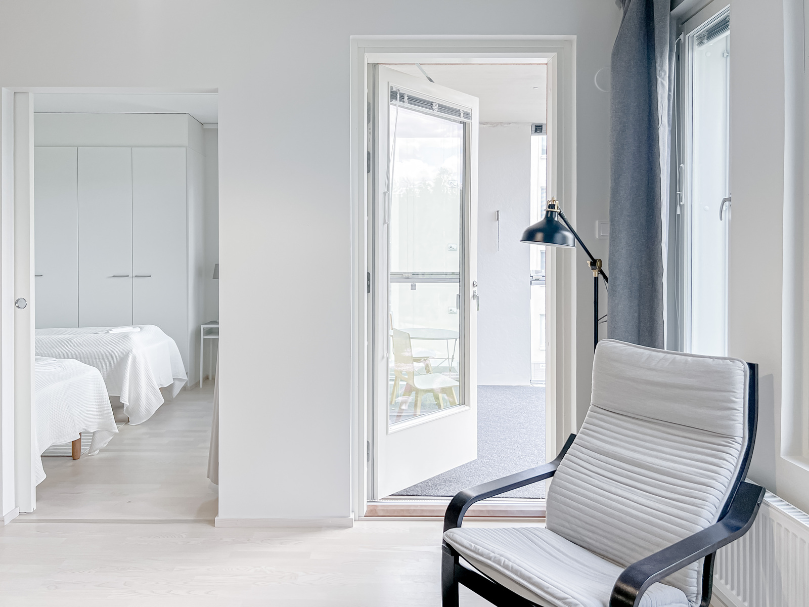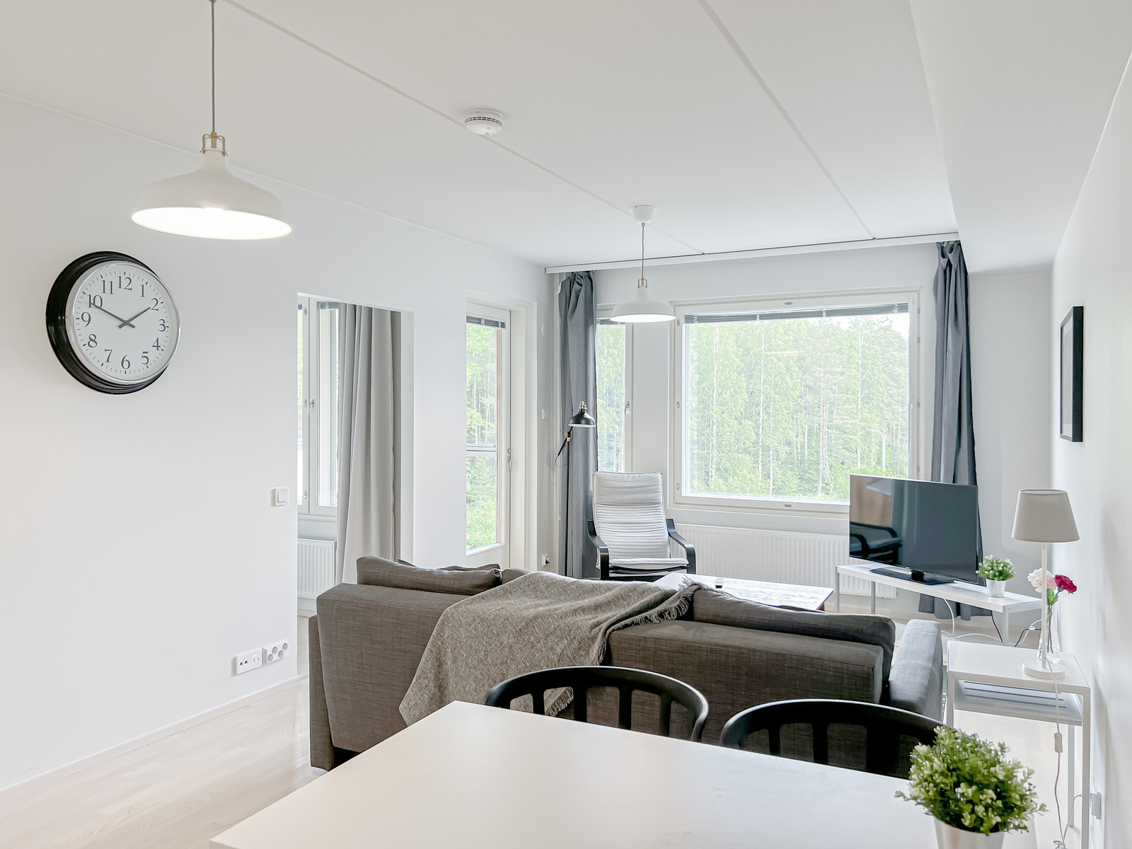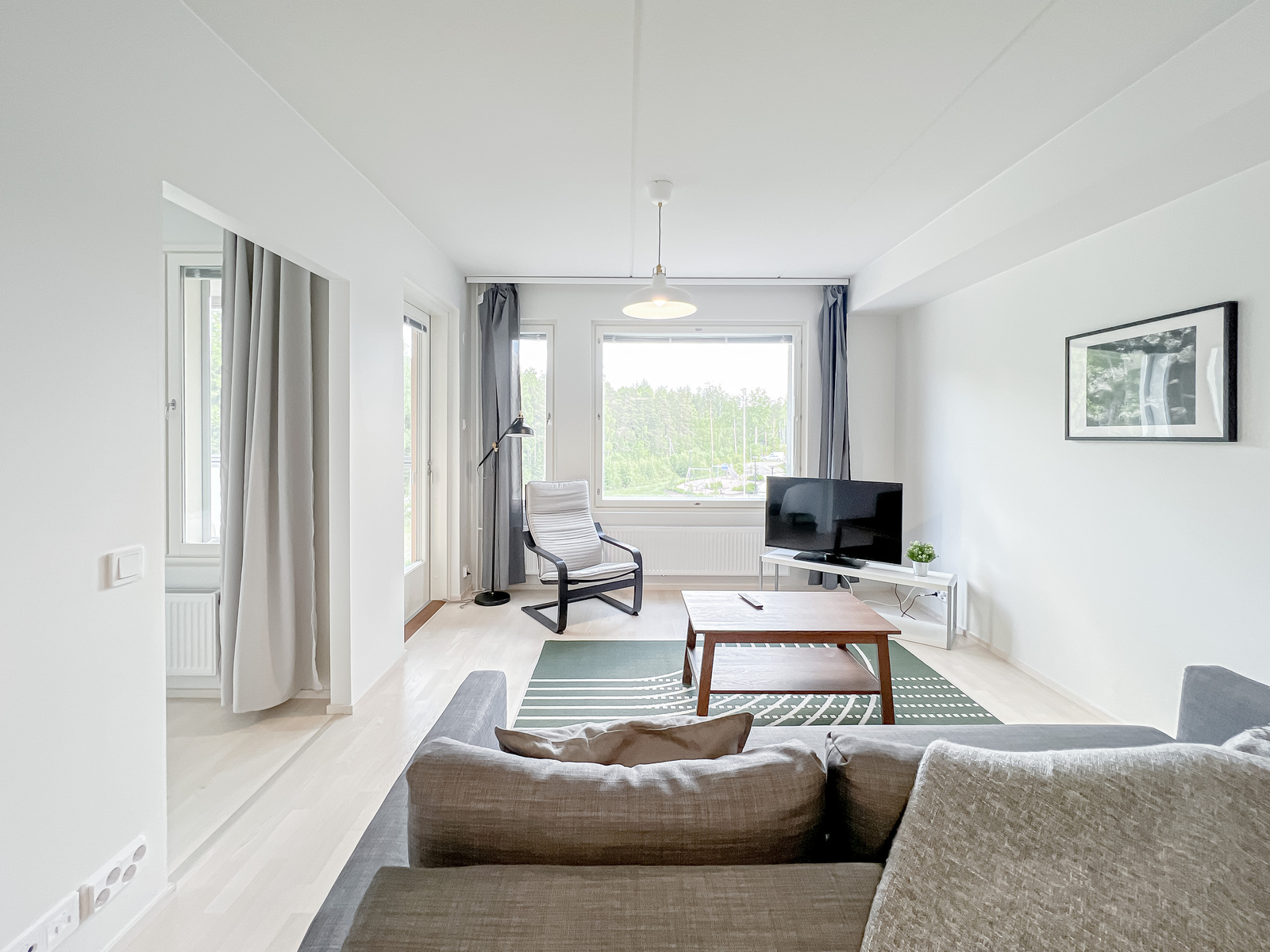 Olohuone ja keittiö muodostavat avonaisen oleskelutilan yhdessä olemiseen. Modernissa avokeittiössä, joka on kuin tyylikäs sisustuselementti itsessään, on integroidut ja laadukkaat kodinkoneet. Asunnossa on kaksi mukavan kokoista makuuhuonetta, sekä lasitettu parveke vehrein näkymin.