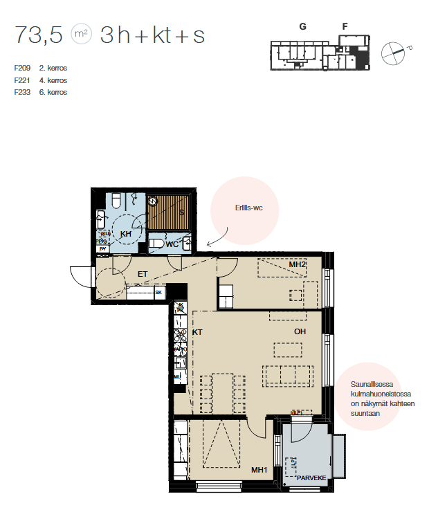 Tässä kodissa on toimiva pohjaratkaisu. Avara olohuoneen ja keittiön yhdistelmä kutsuu viihtymään. Kylpyhuone on kauniisti laatoitettu ja siellä on paikka omalle pyykinpesukoneelle, lisäksi oma rentouttava sauna! Asunnossa on myös käytännöllisesti erillinen WC. Lasitettu parveke tuo tähän kotiin lisätilaa aikaisesta keväästä tunnelmallisiin syksyiltoihin saakka. Huoneiston yhteydessä vuokrataan autopaikka 80€/kk.